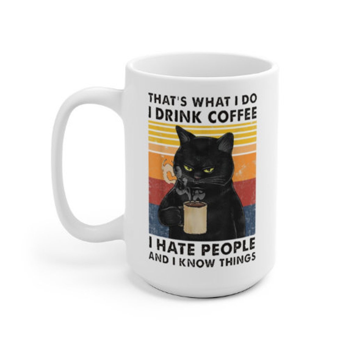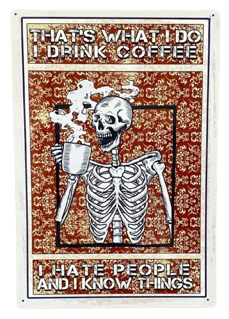 Haha, was für ein genialer Spruch! 'That's What I Do I Drink Coffee I Hate People and I Know Things' - das Blechschild ist ein absoluter Hingucker! Im vintage Retro-Design, 30,5x20,3cm groß. Aus robustem Weißblech/Metall, wasserdicht und langlebig. Mit 4 vorgebohrten Löchern für einfaches Aufhängen. Perfekt für Zuhause, Bar, Büro oder Badezimmer - überall wo's witzig sein soll! Einfach an die Wand nageln und jeden Tag schmunzeln. Macht jeden Raum persönlicher und lustiger. Einfach genial für Kaffeeliebhaber mit Humor!