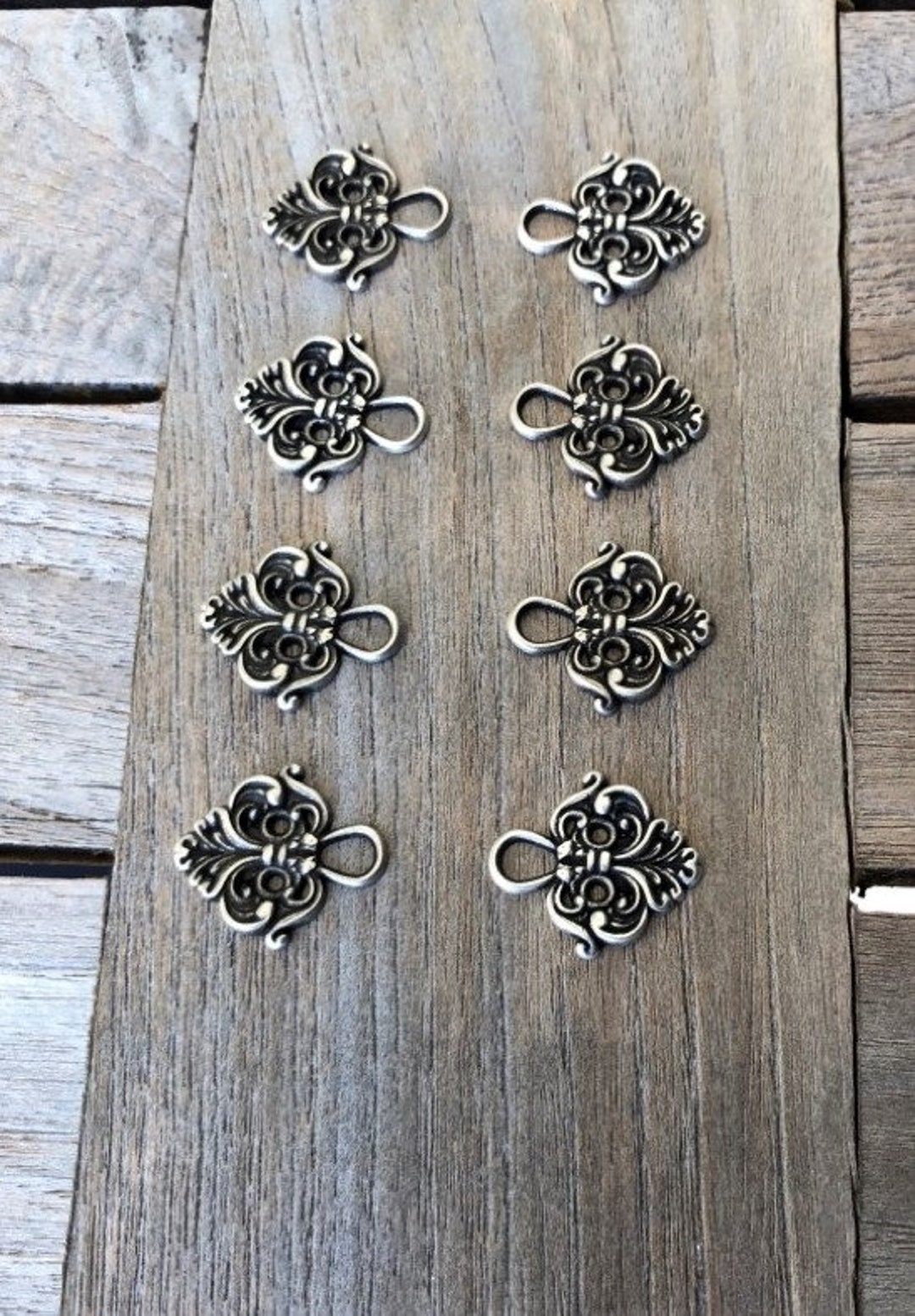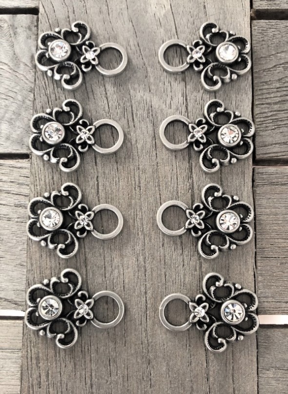 Für alle Dirndl-Fans: Diese herzförmigen Miederösen in Altsilber sind einfach entzückend! Mit feinem Edelweiß-Motiv verleihen sie deiner Tracht den letzten Schliff. Aus stabilem Metall, eher matt und rustikal - genau wie's sein soll. Größe ca. 26x19mm, perfekt zum Annähen an Dirndl oder Corsage. Im Set sind 4 Paare (also 8 Teile) enthalten, made in Europe. Damit machst du deine Tracht zum absoluten Hingucker - ob auf dem Oktoberfest oder anderen festlichen Anlässen. Einfach annähen und sich über den authentischen Look freuen!