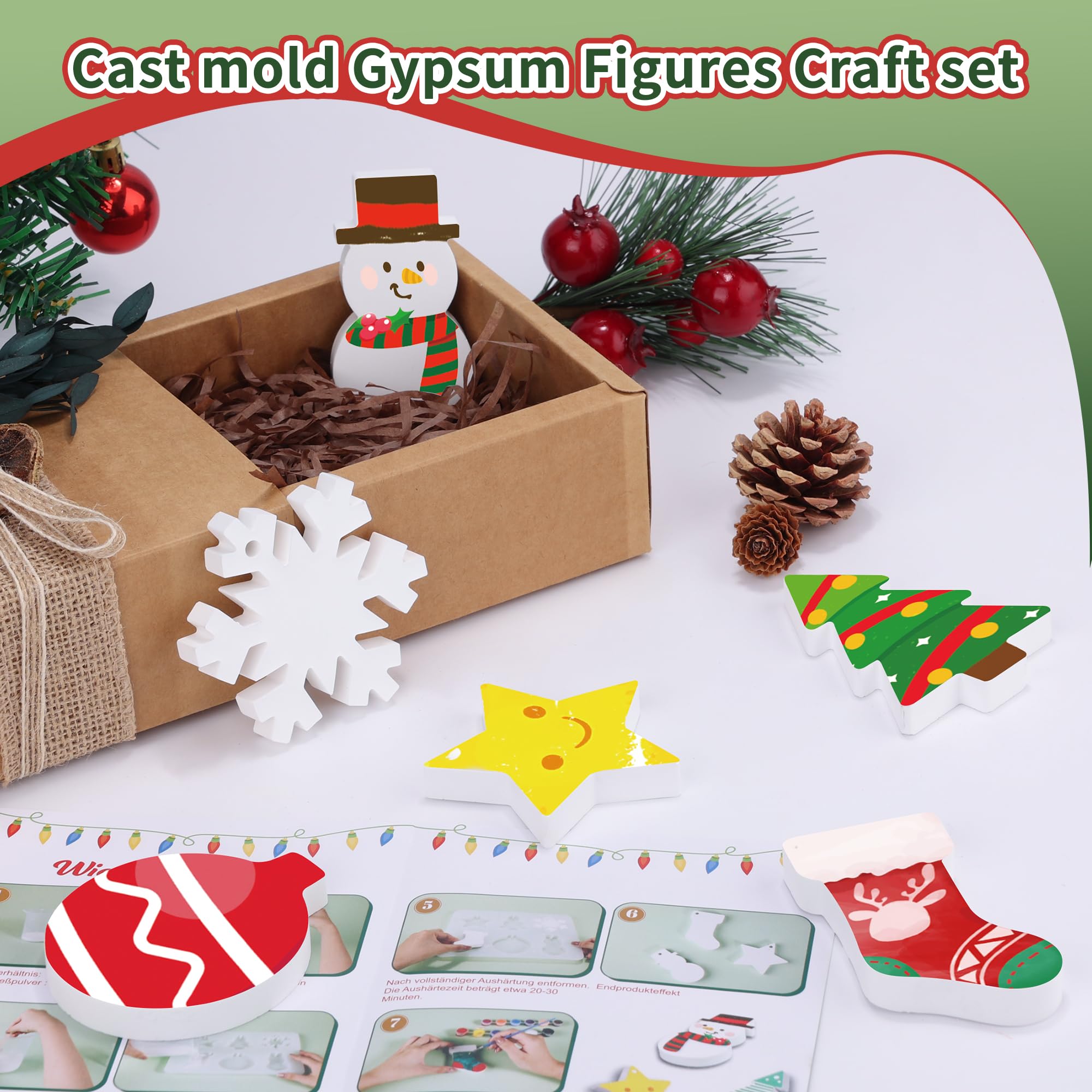 Bastelspaß für die ganze Familie! Dieses komplette Weihnachts-Gießset enthält alles was du brauchst: 500g Gießpulver, festliche Silikonformen mit Schneeflocken und Schneemännern, 12 bunte Pigmente, Hanfseil und mehr. Einfach Gießpulver und Wasser im Verhältnis 3:1 mischen, in die Formen füllen und nach 20-30 Minuten schon entformen. Perfekt für Anfänger und Kinder - keine Blasenbildung garantiert! Kreiere einzigartige Weihnachtsdekorationen, die sich auch super als Geschenke eignen. Ob für gemütliche Bastelabende oder kreative Kindergeburtstage - hier ist Spaß garantiert. Einfach anrühren, gießen und staunen, was du alles erschaffen kannst!