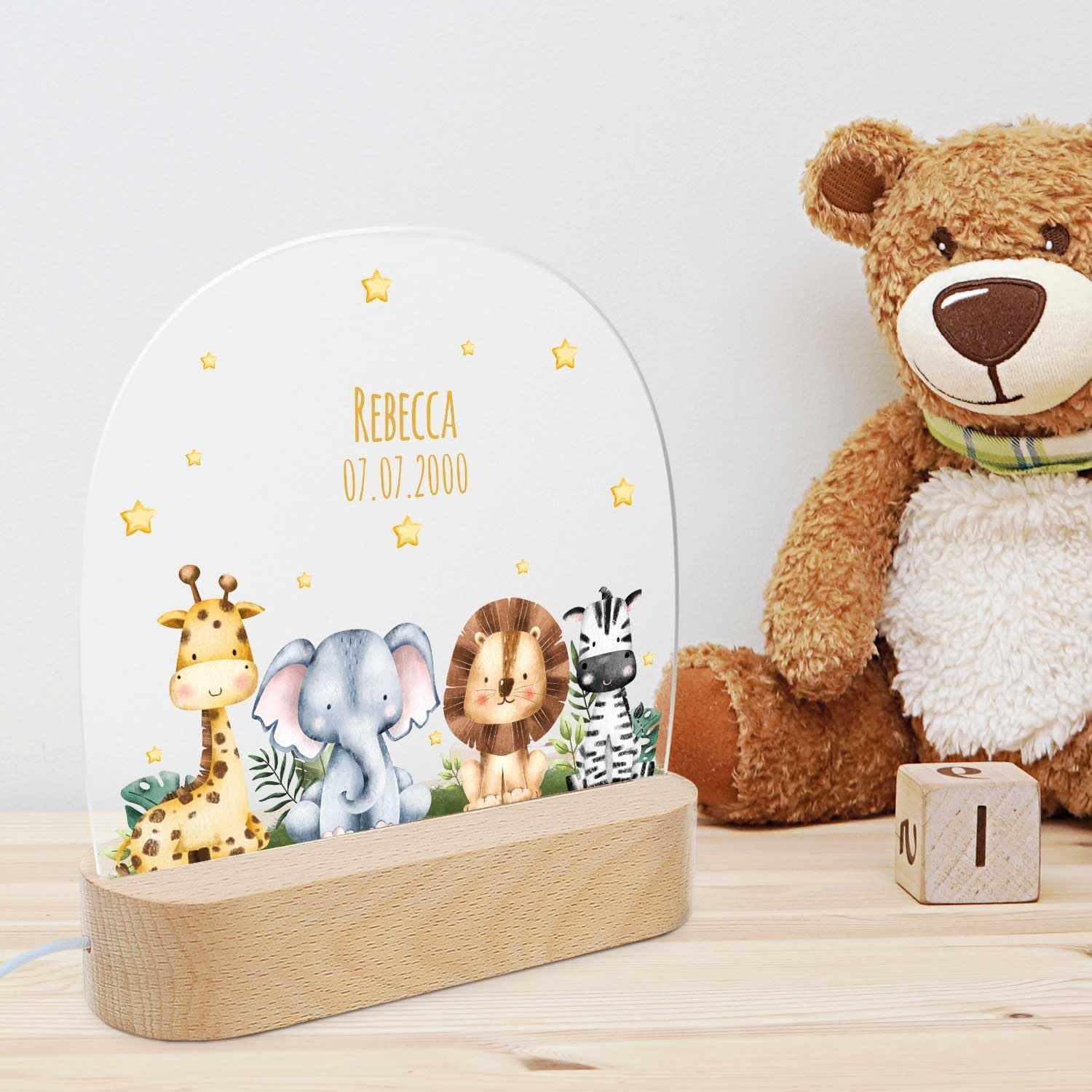 Ein Nachtlicht, das nicht nur leuchtet, sondern auch persönlich ist? Das LARIFEE Safari Nachtlicht macht's möglich! Personalisiere es mit dem Namen und Geburtsdatum deines Kindes - so wird es zu einem einzigartigen Erinnerungsstück. Hergestellt aus stabilem Buchenholz und bruchsicherer Acrylglasplatte, ist es absolut kindgerecht. Das LED-Licht ist dimmbar und lässt sich von warmem bis kaltem Weiß einstellen - perfekt zum Vorlesen, Einschlafen oder als sanftes Schlummerlicht. Das süße Safari-Motiv wird per UV-Druck aufgebracht, ist farbintensiv und absolut unbedenklich. Ob zur Geburt, Taufe oder zum Geburtstag - dieses Nachtlicht ist ein Geschenk, das lange Freude bereitet und deinem Kind Geborgenheit schenkt. Es ist mehr als nur eine Lampe: Es ist ein liebevoller Begleiter für die Nacht, der dein Kinderzimmer in einen gemütlichen Ort verwandelt. Ein Must-have für alle Eltern, die das Beste für ihr Kind wollen!