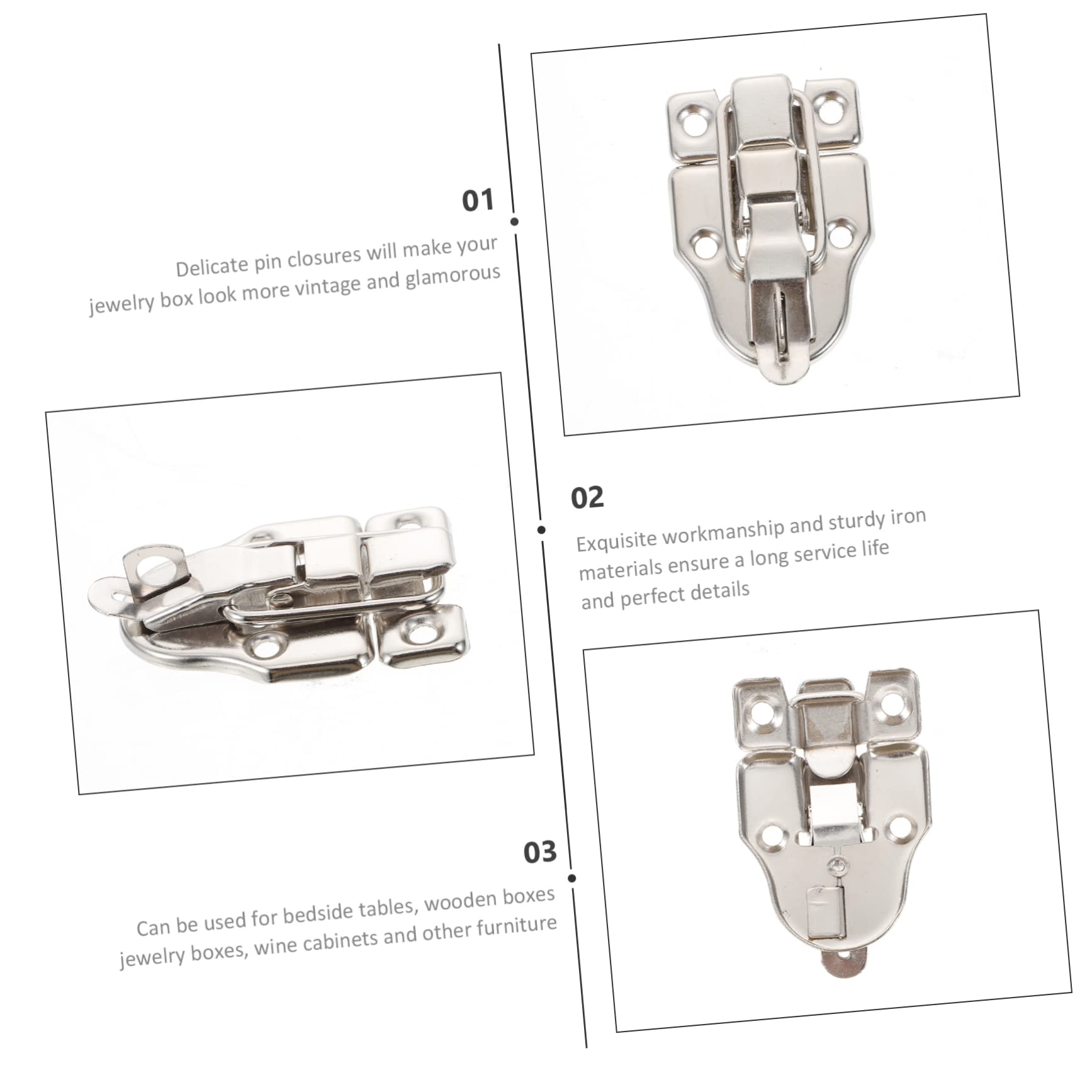 Diese silbernen Koffer-Verschlüsse sind genau das Richtige für deine Bastelprojekte! Im 4er-Set mit allen notwendigen Schrauben - alles was du zum Verschließen brauchst. \\n\\nJeder Verschluss ist 48x32,5x10 mm groß und aus vernickeltem Eisen gefertigt. Das sieht nicht nur schick aus, sondern schützt auch vor Rost und Verschleiß. \\n\\nDer federbelastete Mechanismus sorgt für sicheres und einfaches Schließen. Einfach die beiden Teile zusammenklappen und sie rasten zuverlässig ein. \\n\\nPerfekt für: \\n- Selbstgemachte Schmuckschatullen \\- Schmuckkästchen und Geschenkboxen \\- Vogelhäuschen \\- DIY Bastelprojekte \\- Modellbau \\n\\nDie Lochabstände betragen 24 mm an der kurzen und 26 mm an der langen Kante, mit 3,5 mm Lochdurchmesser - passt perfekt für die meisten Projekte. \\n\\nMit diesen hochwertigen Verschlüssen sehen deine Bastelarbeiten gleich viel professioneller aus - ob für dich selbst oder als Geschenk!