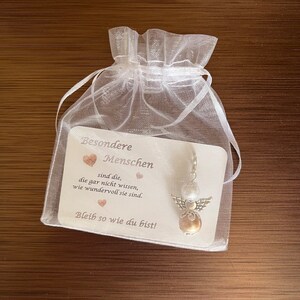 Suchst du nach einer kleinen, aber herzlichen Aufmerksamkeit? Dieser süße Schutzengel-Schlüsselanhänger ist perfekt für besondere Menschen in deinem Leben! Das Set besteht aus einer hübschen Karte im Format 8,5x5,5cm mit dem Spruch 'Besondere Menschen' und einem niedlichen Perlenengel mit silbernen Flügeln und Karabiner (ca. 4,5cm groß). Alles kommt fein verpackt in einem zarten Organzasäckchen - da musst du nichts mehr machen! Ob für Oma, Mama, die beste Freundin oder als Gastgeschenk - diese kleine Aufmerksamkeit kommt immer gut an. Besonders zu Weihnachten, zum Geburtstag oder einfach mal so als Dankeschön. Einfach überreichen und strahlende Augen garantieren! So zeigst du deine Wertschätzung auf eine ganz besondere Art.