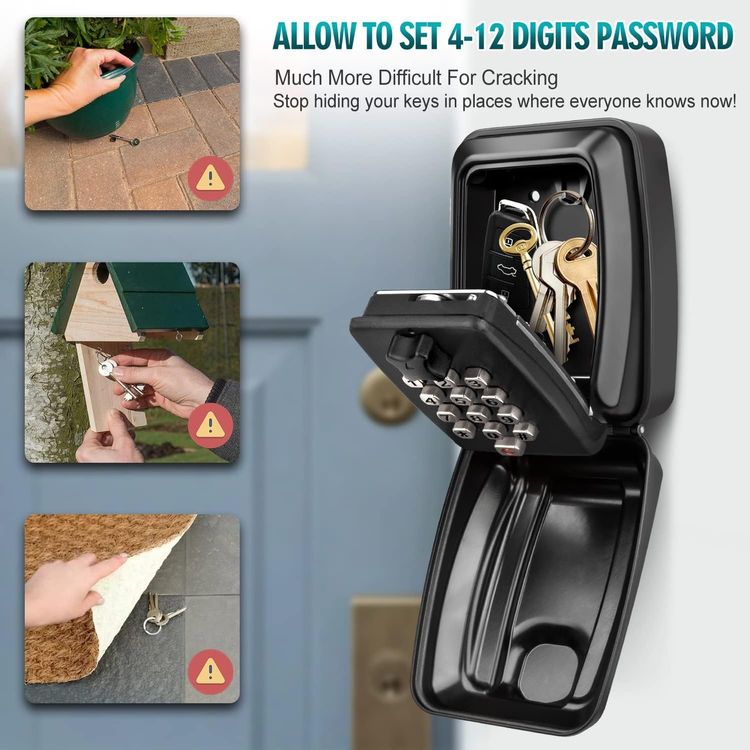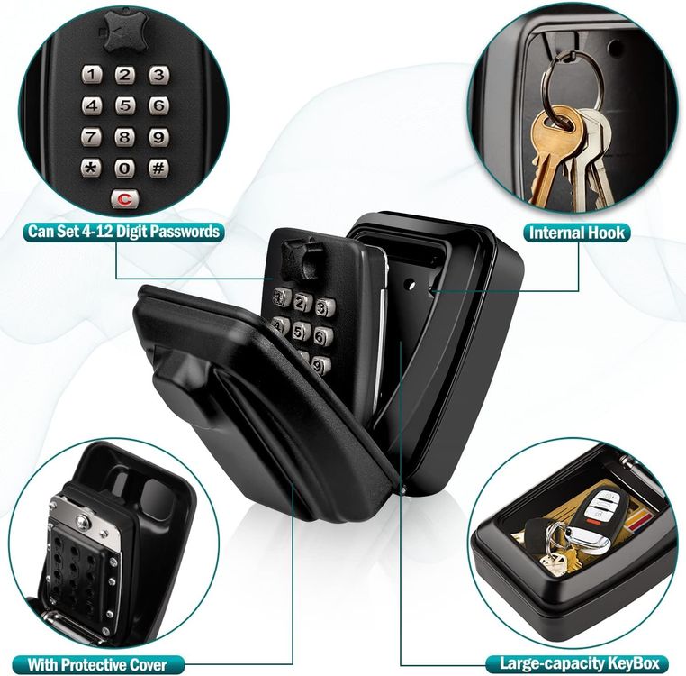 Schluss mit versteckten Schlüsseln unter der Matte! Dieser schlaue Schlüsseltresor mit 12-stelligem Zahlencode gibt dir endlich Sicherheit und Flexibilität. Aus hochfester Aluminiumlegierung und gehärtetem Stahl - absolut einbruchsicher! Die wetterfeste Abdeckung hält Regen, Schnee und Staub zuverlässig ab. Platz für 5-8 Schlüssel, Zugangskarten oder sogar etwas Bargeld. Einfache Wandmontage inklusive aller Schrauben, Dübel und einem Doppelkopfschraubendreher. Perfekt für Haus, Büro, Garage, Ferienhaus oder für Haustiersitter und Handwerker. Einfach Code eingeben, Box öffnen, Schlüssel nehmen - fertig! Nie wieder warten lassen oder Schlüssel hinterlegen müssen. Der 4-12-stellige Code bietet tausende Kombinationsmöglichkeiten. Achtung: Code nach Reset unbedingt notieren oder fotografieren! Endlich smarte Schlüsselverwaltung für's moderne Leben!