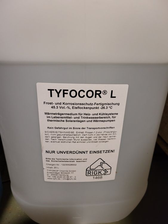 Dieses Tyfocor Konzentrat ist der professionelle Frost- und Korrosionsschutz für Ihre Solaranlage! In der 20 Liter Gebindegröße ideal für größere Anlagen oder den professionellen Einsatz. Auf Basis von unbedenklichem Propylenglykol bietet es Frostschutz bis -50°C und zuverlässigen Korrosionsschutz für alle Komponenten. Nahezu geruchlos und vollständig mit Wasser mischbar - einfach nach Herstellerangaben verdünnen. Hält die Wärmeübertragungsflächen sauber und sichert so einen gleichbleibend hohen Wirkungsgrad Ihrer Anlage. Perfekt für: Thermische Solaranlagen, Wärmepumpen, Kühl- und Heizsysteme im Lebensmittel- und Trinkwasserbereich. Technische Daten: Siedepunkt 150°C, Stockpunkt -50°C, Dichte 1,054-1,058 g/cm³. Übrigens: Auch für bestehende Anlagen zur Nachfüllung oder beim Wechsel der Flüssigkeit ideal! Deutsche Qualität, die sich bewährt hat - einfach zuverlässig und langlebig. Ein Muss für jeden Solaranlagen-Betreiber!