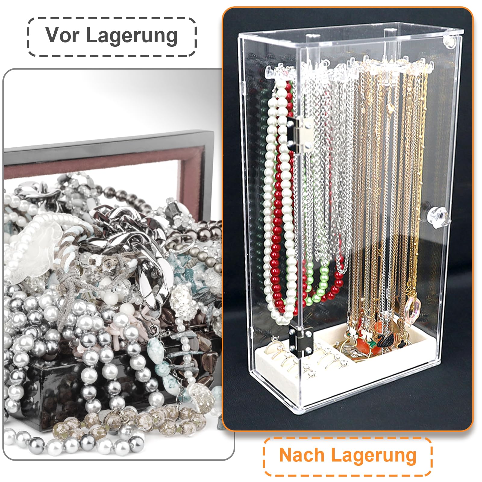 Endlich Ordnung im Schmuckkästchen! Dieser elegante Acryl-Kettenständer hat zwei Etagen mit insgesamt 80 Haken - Platz für all deine Ketten, Armbänder und mehr. Aus hochwertigem Acryl, komplett transparent und super stabil. Das abnehmbare Design macht die Reinigung einfach. Die verdickte Basis mit rutschfesten Pads sorgt für Standfestigkeit. Sieht nicht nur gut aus, sondern ist auch mega praktisch. Perfekt fürs Schlafzimmer, Badezimmer oder die Kommode. Dein Schmuck ist immer griffbereit und übersichtlich sortiert. Ein echter Hingucker und ein praktisches Organisationswunder in einem! Auch ein tolles Geschenk für Schmuckliebhaber.