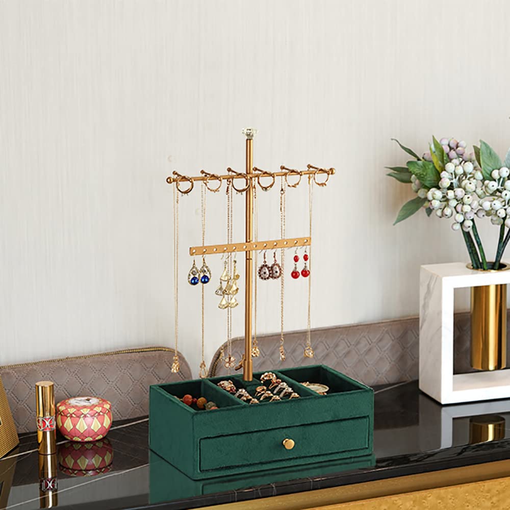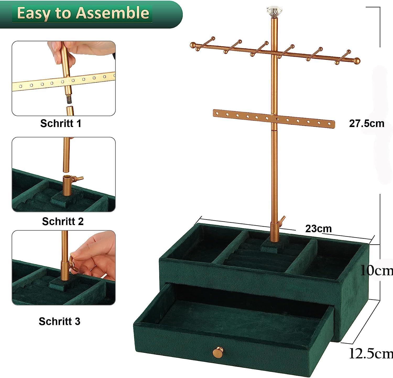 Endlich Ordnung im Schmuckchaos! Dieser wunderschöne Schmuckständer mit 6 Ebenen ist deine Rettung gegen verknotete Ketten und verlorene Ohrringe. Das goldene T-Form Design sieht nicht nur mega elegant aus, sondern ist super praktisch: Oben hängen deine Ketten und Armbänder ohne zu verheddern, unten findest du Platz für all deine Ohrringe. Das weiße Holztablett ist perfekt für Ringe, Lippenstifte und andere kleine Schätze. Einfach aufzustellen - keine komplizierte Montage nötig! Sieht aus wie ein stylisches Deko-Objekt, aber kann echt all deinen Schmuck aufnehmen. Perfekt für die Kommode, ohne viel Platz wegzunehmen. Macht sich auch super als Geschenk für deine beste Freundin, Mama oder Schwester! Hol dir diesen Alleskönner und finde deine Lieblingsstücke endlich wieder, ohne langes Suchen.