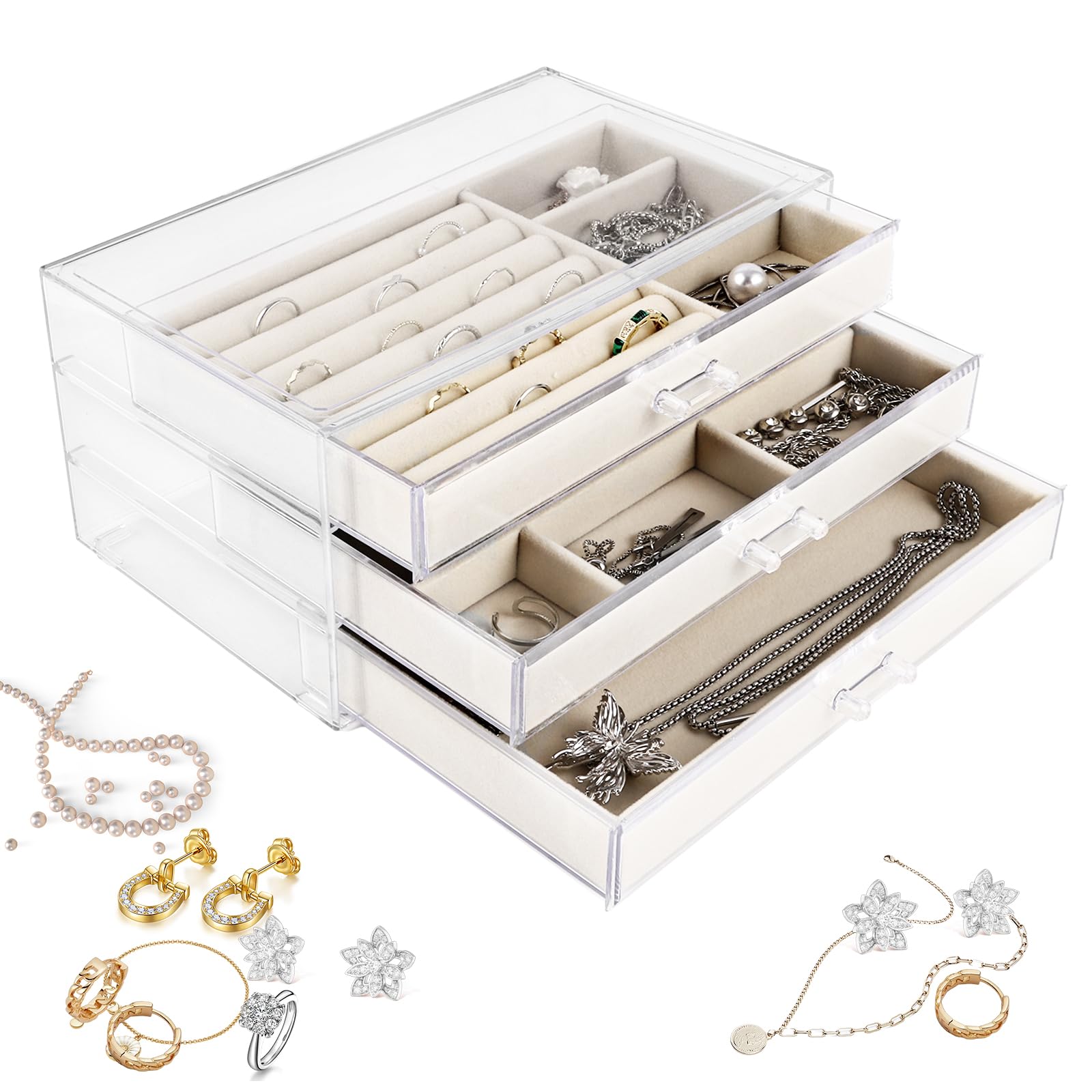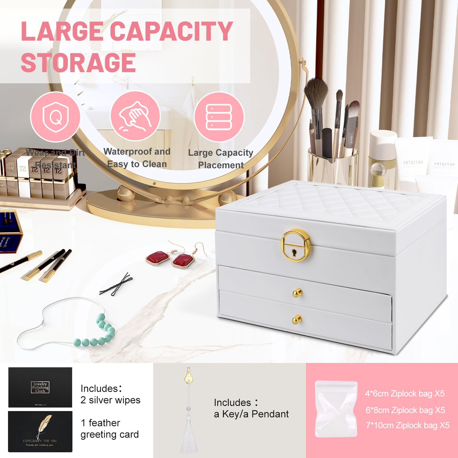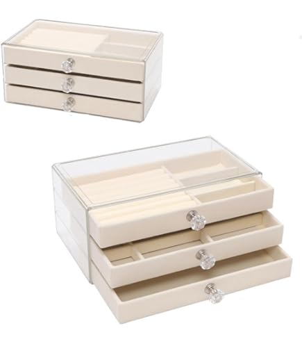 Schluss mit dem Schmuck-Chaos! Dieses 3-ebige Schmuckkästchen von HOUSLUX bringt endlich Ordnung in deine Schätze. Mit zwei praktischen Schubladen und verschiedenen Fächern für jeden Schmucktyp. Im Deckel findest du Platz für bis zu 8 Ketten - endlich keine verknoteten Halsketten mehr! Die obere Ebene und die Schubladen bieten genug Raum für Ohrringe, Ringe, Armbänder und alles andere. Maße: 23x17x13,5cm - perfekt für den Schminktisch oder die Kommode. In schickem Perlweiß mit hochwertiger Lederoberfläche, die nicht verblasst. Innen ist alles mit weichem Samt ausgekleidet - da kratzt sich nichts! Und das Beste: Es kommt komplett verpackt mit Geschenkpapier und Umschlägen - ideal als Geschenk für Mama, Freundin oder Tochter. Zu Geburtstagen, Weihnachten, Muttertag oder einfach so. Sie wird sich riesig freuen! So macht Schmuckaufbewahrung endlich Spaß und sieht dabei noch super stylisch aus.