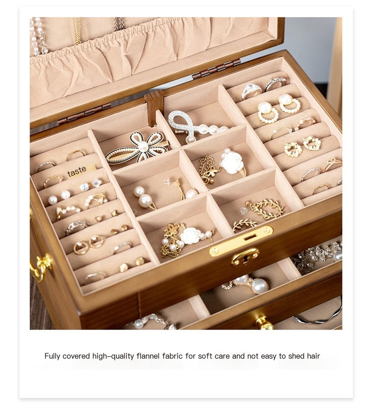 Die durchdachte Aufteilung bietet Platz für alles: Spezielle Fächer für Uhren, Ohrringe, Ringe, Halsketten und Armbänder sorgen für perfekte Ordnung. Das Holz wurde mit Wachs-Öl behandelt, was die natürliche Maserung wunderbar zur Geltung bringt und das Kästchen besonders langlebig macht.