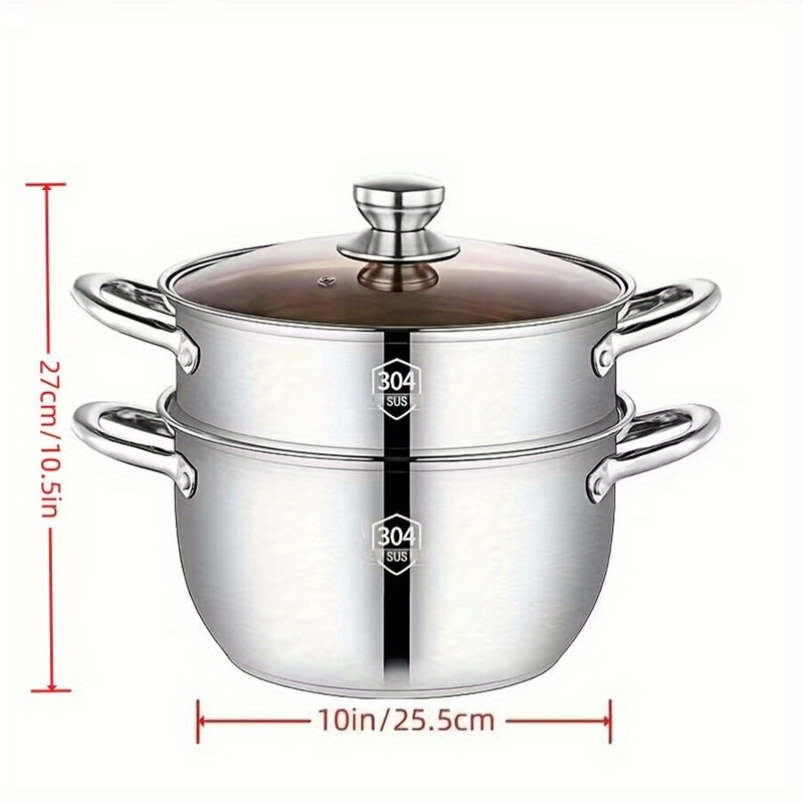 Dieser vielseitige 5-stufige Dampfgarer aus Edelstahl macht das Kochen zum Erlebnis! Mit 26 cm Durchmesser und explosionssicherem Glasdeckel. 4 Dampfgitter + 1 großer Kochtopf - kannst du je nach Bedarf kombinieren. Perfekt zum Dämpfen von Fisch, Gemüse, Reis und gedämpften Brötchen, gleichzeitig kannst du unten Suppe kochen. Passt auf alle Herdarten: Induktion, Gas, Elektro. Das überlappende Design spart Platz in der Küche. Einfach zu reinigen, rostfrei und langlebig. Mit Dampfablassventil für sichere Handhabung. Professionelle Küche für zu Hause - gesund und lecker!
