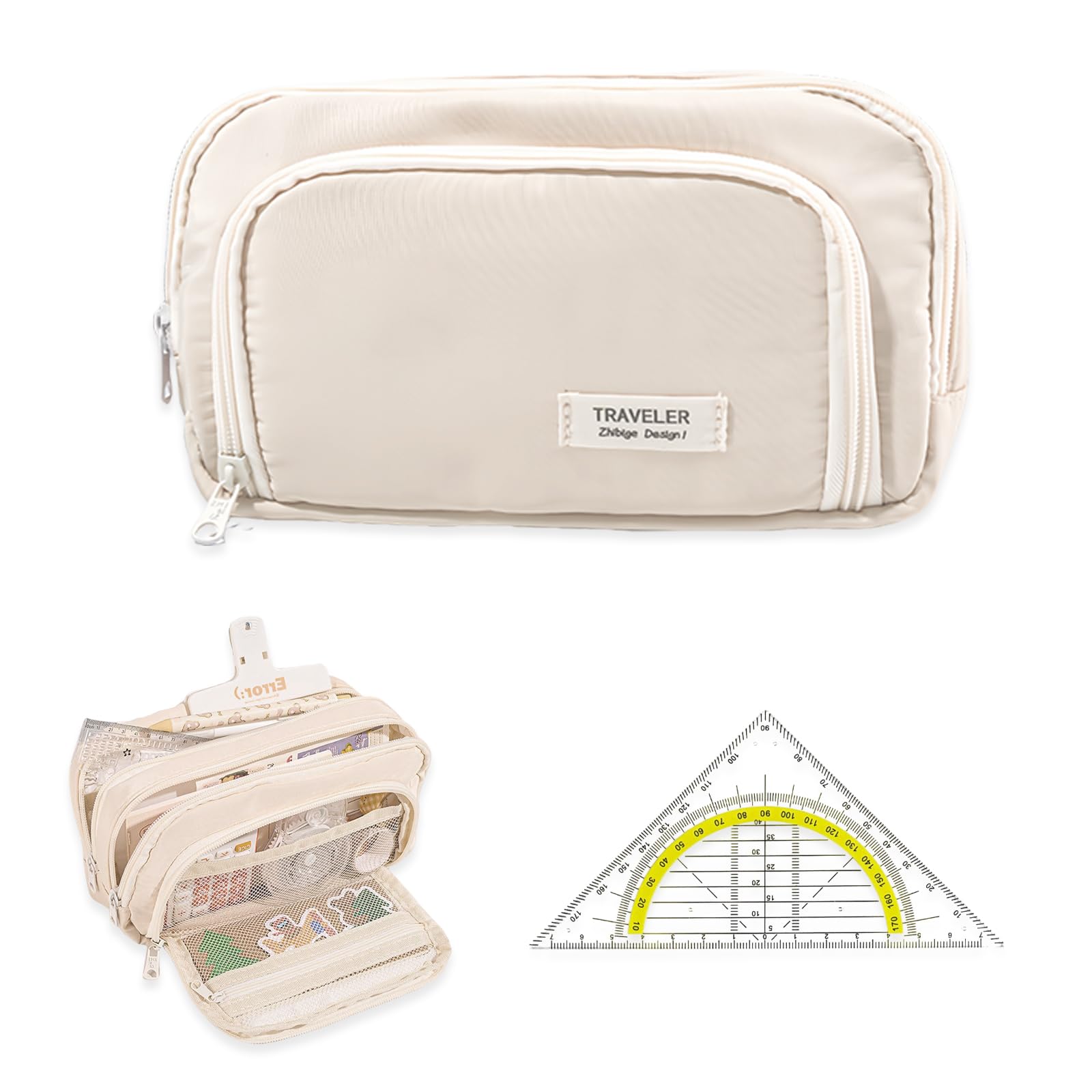 Wow, dieses Federmäppchen hat wirklich Platz ohne Ende! Mit drei Schichten und einem Netzfach innen findest du alles sofort - kein langes Suchen mehr. Die Maße von 22x9x12,5 cm bieten Platz für hunderte Stifte - perfekt für Schüler, Studenten oder Künstler. Aus robustem Polyester gefertigt - kratzfest, abriebfest und die Farbe verblasst nicht. Spritzwassergeschützt und leicht zu reinigen. Das coole Geodreieck ist schon im Lieferumfang enthalten! Aber das ist noch nicht alles: Du kannst das Mäppchen auch als Kosmetiktasche, für digitales Zubehör oder als Basteltasche verwenden. Einfach den Reißverschluss aufziehen und du siehst sofort alle deine Stifte. In schickem Beige sieht es total ästhetisch aus. Perfekt für Schule, Büro, Uni oder unterwegs. Auch ein super Geschenk für Lehrer oder Freunde - praktisch und stylisch zugleich. Einfach alles reinpacken, was du brauchst - dieses Mäppchen schafft das!