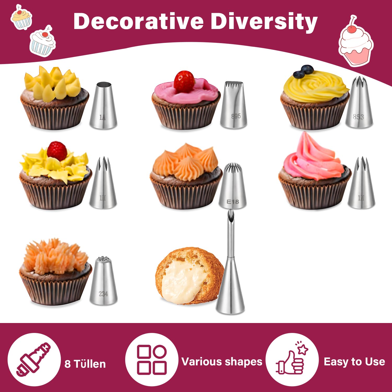 Hobby-Bäcker, dieses 12-teilige Spritzbeutel-Set macht euch zum Profi in der Kuchendekoration! Enthält 8 verschiedene Edelstahl-Tüllen mit unterschiedlichen Mustern - von Sterne über Blüten bis zu speziellen Formen. Dazu eine 35 cm lange, reißfeste Spritztüte mit Baumwollbeschichtung innen, 2 Adapter und eine praktische Reinigungsbürste. Alles aus hochwertigem Edelstahl nach EU-Normen - lebensmittelecht und super langlebig. Voll spülmaschinenfest und wiederverwendbar - einfach reinigen und immer wieder verwenden. Perfekt für Torten, Cupcakes, Plätzchen und vieles mehr. Mit der kleinen Bürste werden auch die feinsten Muster in den Tüllen blitzsauber. Ob für Geburtstage, Hochzeiten oder einfach mal so - damit gelingen euch professionelle Verzierungen wie beim Konditor. Ein super Geschenk für alle Backbegeisterten - ob zu Weihnachten, Muttertag oder einfach als Aufmerksamkeit. Macht das Backen zum echten Erlebnis!