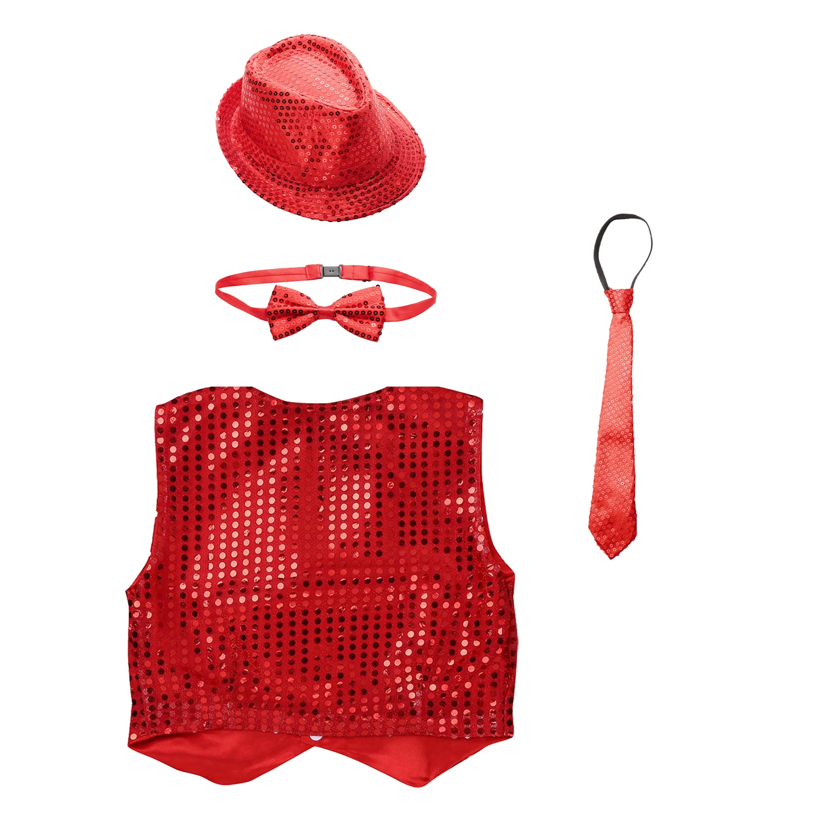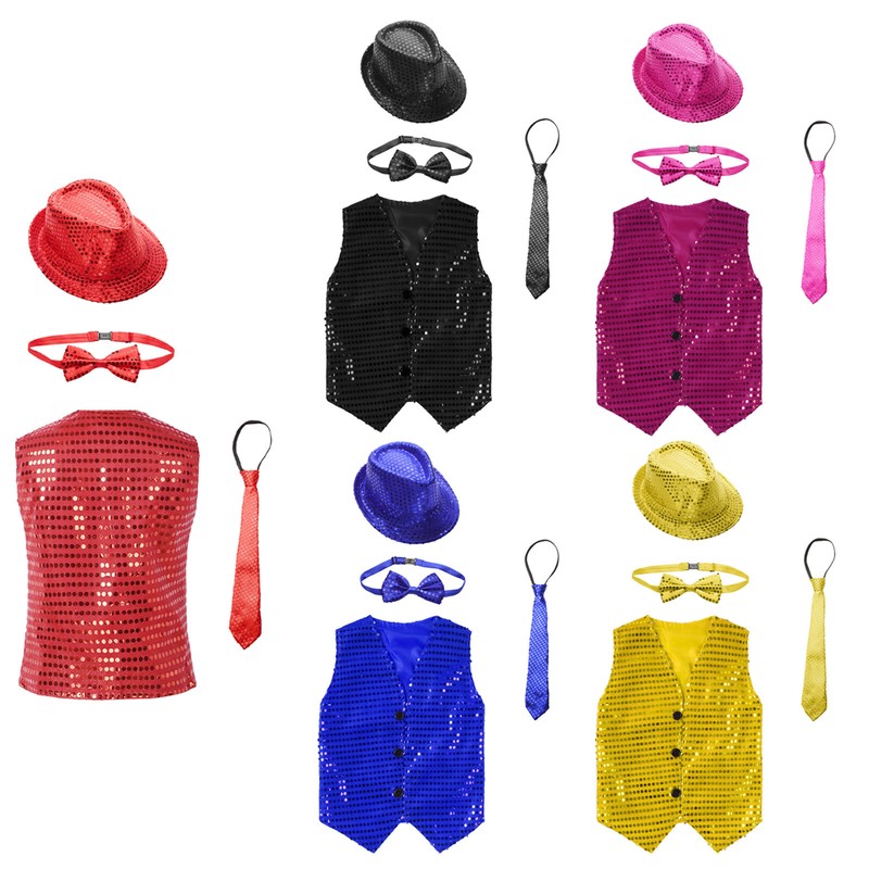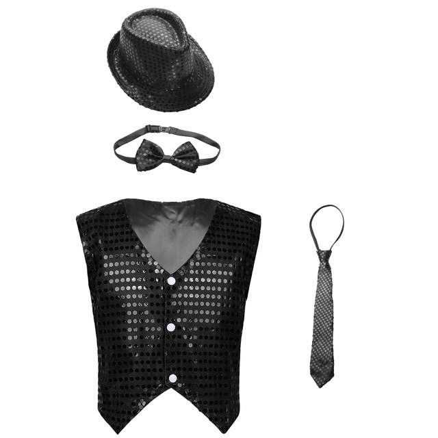 Wow, was für ein glamouröses Outfit für kleine Gentlemen! Dieses 4-teilige Set mit Pailletten-Weste, Hut, Fliege und Krawatte macht jeden Jungen zum Star auf der Bühne oder bei der Party. Die Weste aus 90% Polyester und 10% Pailletten glitzert und funkelt bei jeder Bewegung. Ärmellos mit V-Ausschnitt und Knopfverschluss - super einfach an- und auszuziehen. Hut und Fliege sind verstellbar und passen immer perfekt. Von Gr. 80 für 9-12 Monate bis Gr. 185 für 17-18 Jahre ist für jede Altersstufe was dabei. Ideal für Bühnenauftritte, Jazz-Tanz, Geburtstage oder besondere Familienfeiern. Dein kleiner Mann wird begeistert sein!
