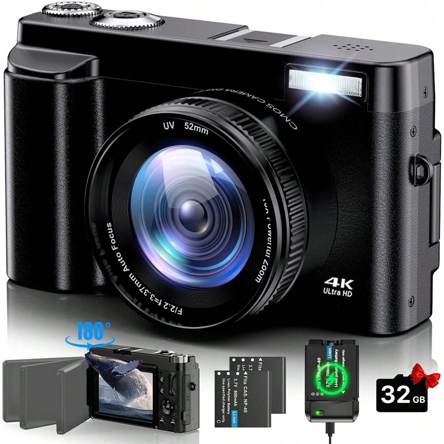 Foto-Einsteiger aufgepasst! Diese kompakte Digitalkamera macht richtig gute Bilder - 48 Megapixel für gestochen scharfe Fotos und 4K Video für tolle Aufnahmen. Der 3-Zoll-Bildschirm klappt um 180° - perfekt für Selfies und Vlogging! Autofokus sorgt für scharfe Bilder, auch bei Bewegung. 16x Digitalzoom bringt alles näher ran. Im Lieferumfang: 32GB Speicherkarte und 2 Akkus - du kannst sofort loslegen! Nur 258 Gramm leicht - ideal für unterwegs. Viele coole Features: Beauty-Funktion, Filtereffekte, Zeitraffer und mehr. Kann auch als Webcam verwendet werden! Perfekt für Jugendliche, Schüler oder Hobby-Fotografen. Einfache Bedienung - großer Spaß! Mit allem was du brauchst um kreativ zu werden. Deine Einstiegskamera in die Welt der Fotografie!
