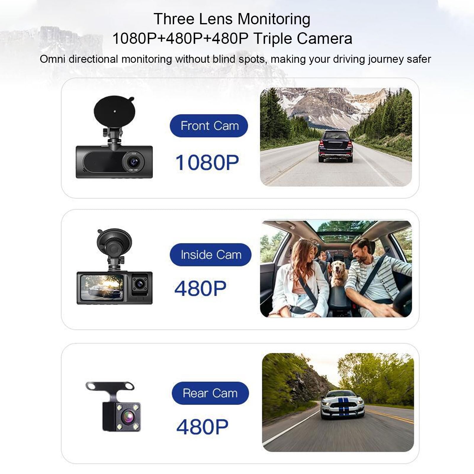 Für mehr Sicherheit im Straßenverkehr! Diese 3-Kanal-Dashcam zeichnet gleichzeitig nach vorne, nach hinten und ins Fahrzeuginnere auf. Die Frontkamera hat 150° Blickwinkel in 1080P, die Innen- und Heckkameras 120° in 480P - damit seht ihr wirklich alles, was um euer Auto passiert.\n\nDas coole an der Nachtsicht: Vier Infrarot-LEDs sorgen dafür, dass ihr auch nachts klare Aufnahmen vom Fahrer und Beifahrer bekommt. Perfekt für Uber-Fahrer, Taxis oder einfach für alle, die sich absichern wollen.\n\nMit der kostenlosen App (Viidure) könnt ihr über WLAN direkt auf die Aufnahmen zugreifen, sie euch ansehen und runterladen. Der G-Sensor schaltet bei einem Unfall sofort auf Aufnahme, und die Loop-Funktion überschreibt automatisch die ältesten Videos, wenn die Speicherkarte voll ist.\n\nAuch im geparkten Zustand schützt euch die Kamera: Die Bewegungserkennung startet die Aufnahme, sobald sich was ums Auto tut. Die Installation ist super einfach - die Rückkamera muss nicht mal am Rückfahrlicht angeschlossen werden. Einfach zusammenstecken und losfahren!\n\nOb für den Beruf oder privat - mit dieser Dreifach-Kamera seid ihr immer auf der sicheren Seite. Und falls mal was passiert, habt ihr den Beweis gleich parat. Die 24-Stunden-Parküberwachung gibt's obendrauf!