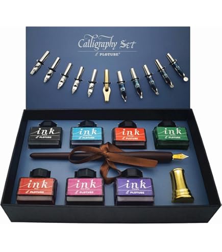 Entdecke die kunstvolle Welt der Kalligraphie! Dieses 8-teilige Set von BELLE VOUS enthält alles, was du für den Einstieg brauchst: 1 Federhalter mit lila Feder, 5 austauschbare Federn (0,8-3mm Breite), 1 Tintenfass mit 15ml schwarzer Tinte und 1 stylischen Stifthalter - alles sicher verpackt in einer luxuriösen Geschenkbox. Einfach Feder in die Tinte tauchen und loslegen - keine Patronen nötig! Der beschwerte Federhalter liegt perfekt in der Hand und ist sowohl für Links- als auch Rechtshänder geeignet. Perfekt für Handlettering, Einladungen, Karten oder persönliche Briefe. Ob du Anfänger oder fortgeschritten bist - dieses Set bietet dir unendliche kreative Möglichkeiten. Ein wunderbares Geschenk für Künstler, Schriftsteller oder alle, die das Besondere lieben!