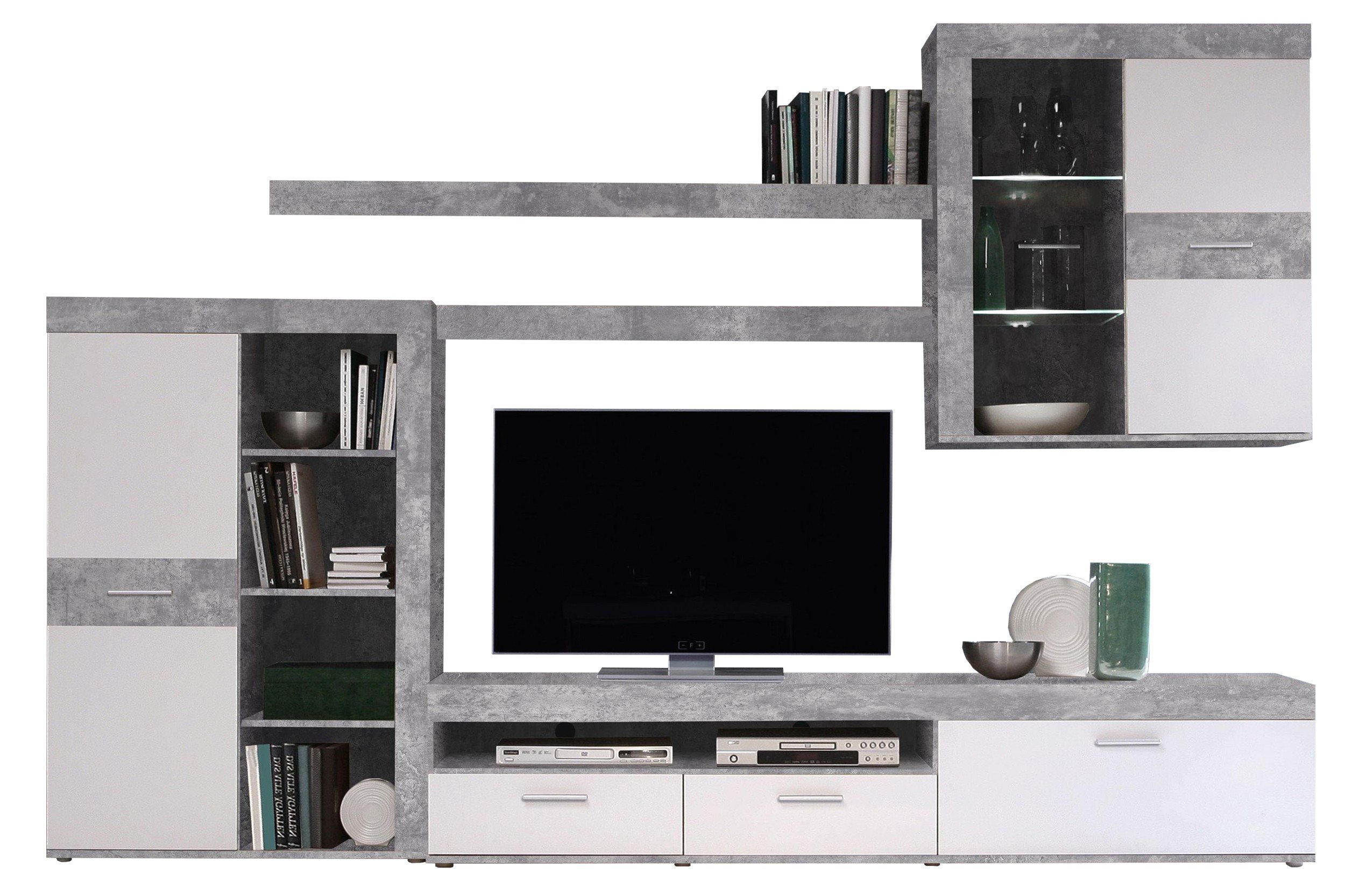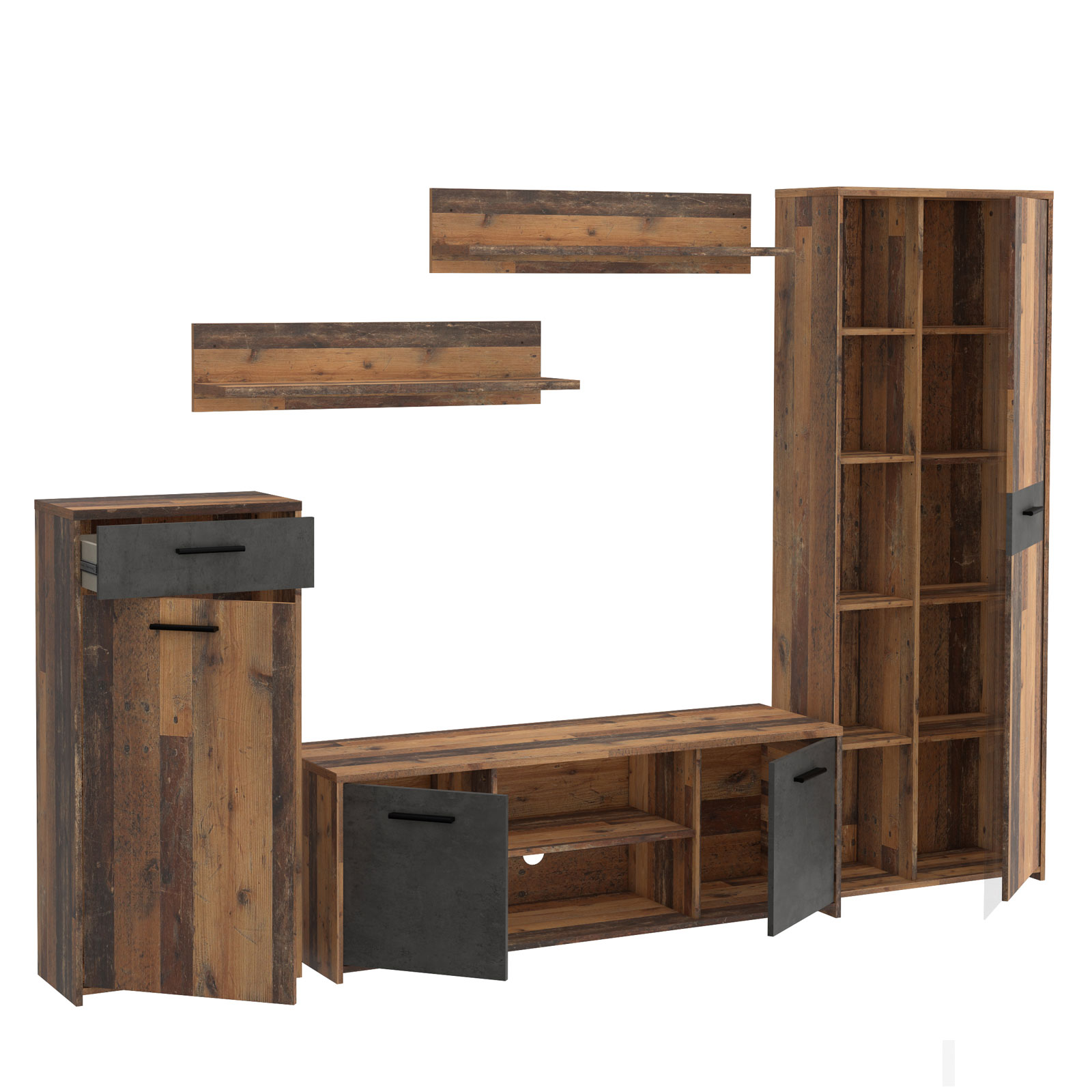Suchest du nach einer richtig modernen Wohnwand? Die Grigor in Betonoptik Dunkelgrau kombiniert mit Old Wood Vintage sieht einfach hammer aus! Mit ca. 290 x 192 cm (BxH) bietet sie mega viel Stauraum und die Elemente kannst du frei stellen.