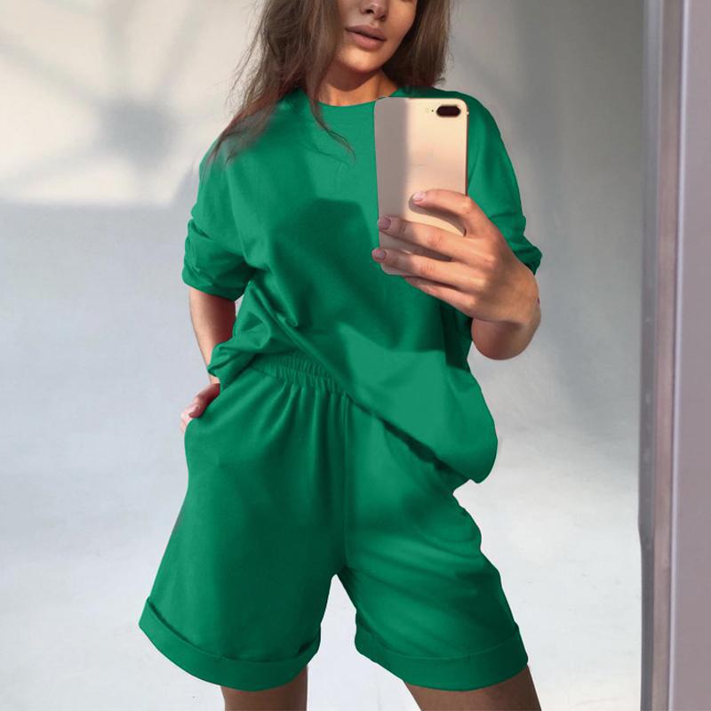 Perfekt für den Sommer: dieses 2-teilige Damen Trainings-Set besteht aus einem schmal geschnittenen Kurzarm-Shirt und hoch taillierten Booty-Shorts. Aus 92% Viskose und 8% Elasthan ist das Outfit super bequem und dehnbar - ideal für Sport und Alltag. Das Rundhals-Shirt und die trendigen Shorts sorgen für einen modischen Look, der sich perfekt kombinieren lässt. Ob für Yoga, Workouts, Shopping oder einfach nur zum Entspannen - dieses Set begleitet dich durch den ganzen Tag. Die weiche, atmungsaktive Qualität sorgt dafür, dass du dich auch bei höheren Temperaturen wohlfühlst. In den Größen S bis XL erhältlich - such einfach deine passende Größe aus der Tabelle aus und schon kann's losgehen mit deinem neuen Lieblings-Outfit!