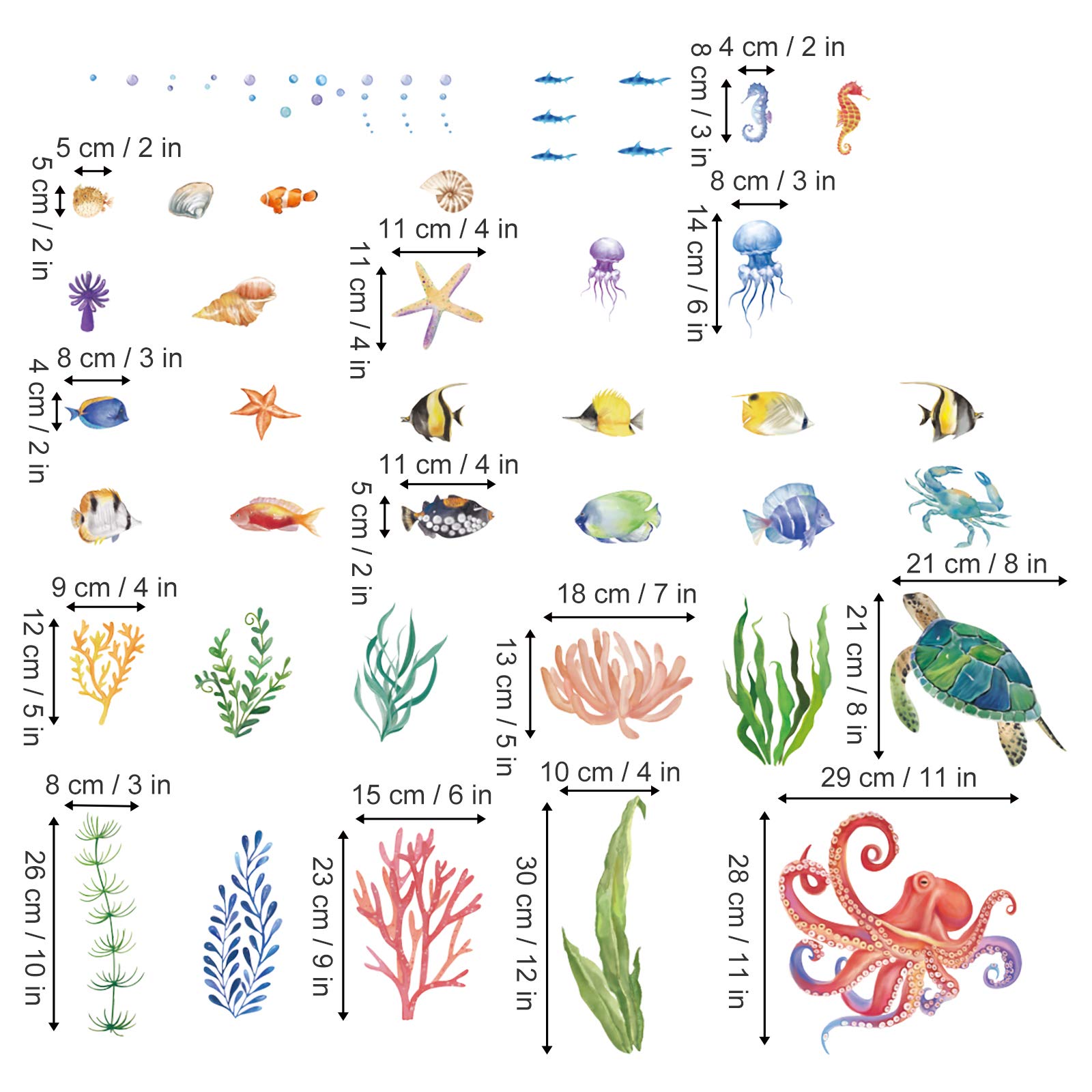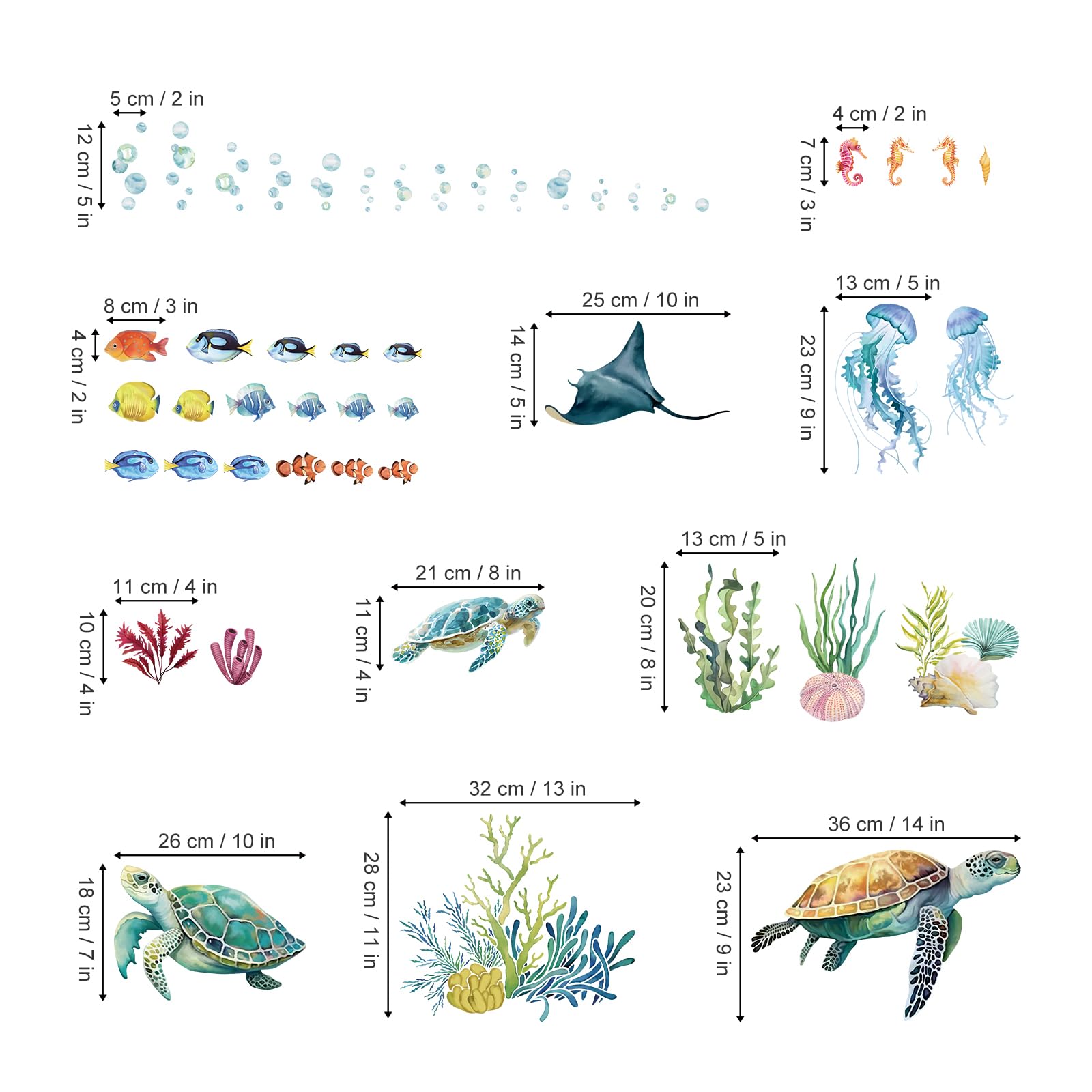 Wie cool ist denn dieses Unterwasser-Wandtattoo? Mit Meeresschildkröten, Fischen, Quallen und Seetang - da wird jedes Kinderzimmer oder Bad zum Ozean-Abenteuer! Kommt in 8 Blättern à 21x30cm - du kannst die Motive frei kombinieren und anordnen! Aus hochwertigem Material - leicht abziehbar, wasserdicht und wiederverwendbar! Haftet auf fast allen glatten Oberflächen: Wände, Fenster, Fliesen, Möbel, Spiegel... Frisch gestrichene Wände sollten 4 Wochen trocknen bevor du die Sticker anbringst! Wenn sich mal was löst - einfach mit Klebestift wieder festmachen! Perfekt für Babyzimmer, Kinderzimmer, Badezimmer, Spielzimmer oder Klassenzimmer! Einfach eine günstige Möglichkeit Räume total zu verwandeln!