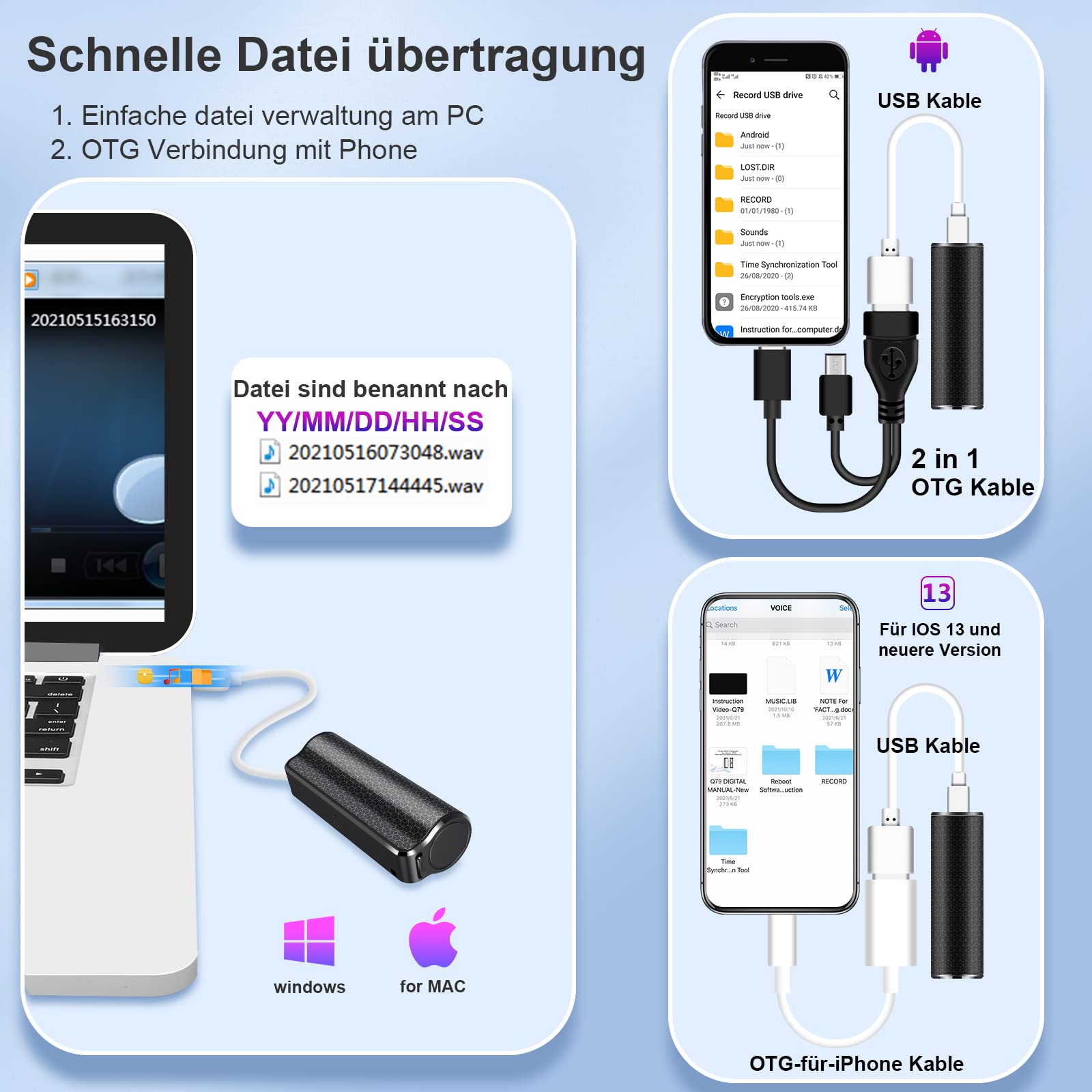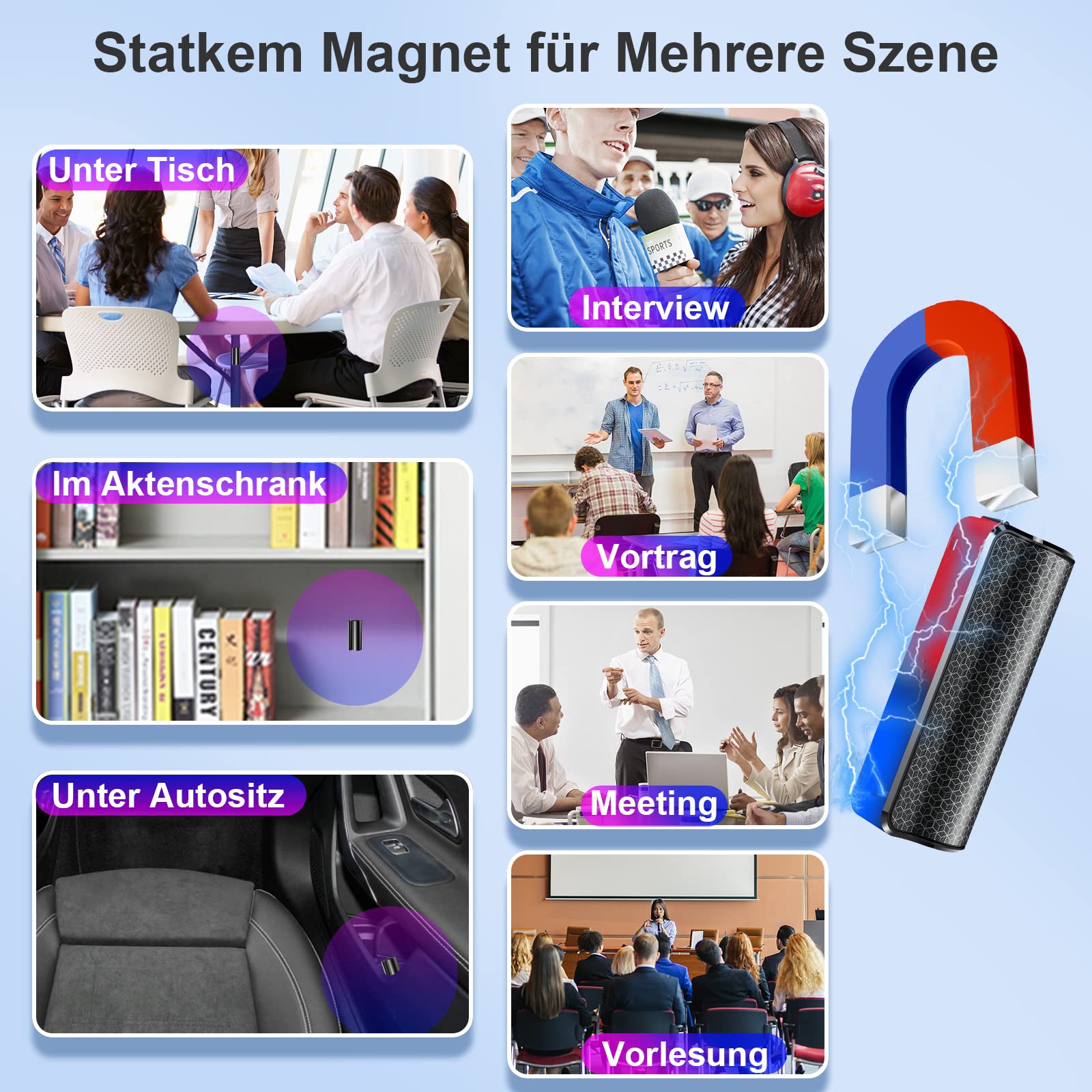 Dieses Diktiergerät ist so klein, dass es kaum auffällt - nur 0,95cm dick! Mit 16GB Speicherplatz für Stunden an Aufnahmen. Die Stimmenaktivierung startet automatisch bei Gesprächen - super praktisch. DSP-Rauschunterdrückung sorgt für kristallklare Aufnahmen auch in lauter Umgebung. Ein-Knopf-Bedienung - einfach einschalten und loslegen. Mit integriertem Magnet für Befestigung an Metallflächen. Perfekt für Meetings, Vorlesungen, Interviews oder einfach für Notizen. Akku warnt bei niedrigem Stand - keine Daten gehen verloren. Einfach der diskrete Begleiter für jeden Tag!