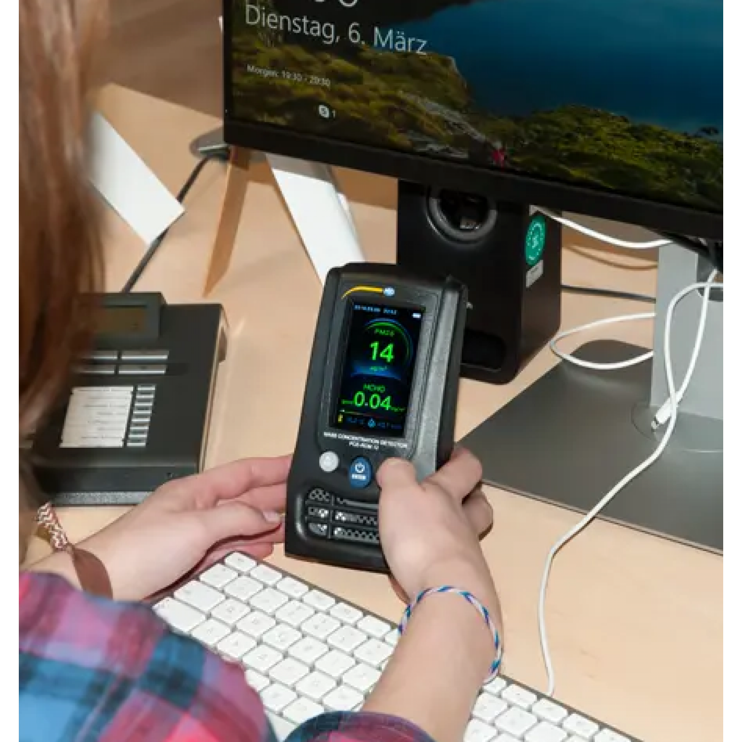 Überwache die Luftqualität in deinen Räumen! Der PCE-RCM 11 Partikelzähler ist dein professioneller Begleiter für gesunde Raumluft. Das Gerät misst präzise Feinstaub (PM2.5 und PM10), Formaldehyd, TVOC (flüchtige organische Stoffe), Temperatur und Luftfeuchte. Mit hellem Display und Farbbewertungsskala erkennst du sofort die Luftqualität. Bis zu 5 Stunden mobil einsetzbar, bei Dauerbetrieb via USB mit Netzstrom verbindbar. Der Akku lädt in nur 2 Stunden komplett auf. Messbereich Feinstaub: 0-2000 µg/m³, TVOC: 0,00-9,99 mg/m³, Formaldehyd: 0,00-5,00 mg/m³. Perfekt für zu Hause, Büros oder Schulen - behalte die Schadstoffbelastung im Blick und sorge für ein gesundes Raumklima. Einfache Bedienung, professionelle Ergebnisse!