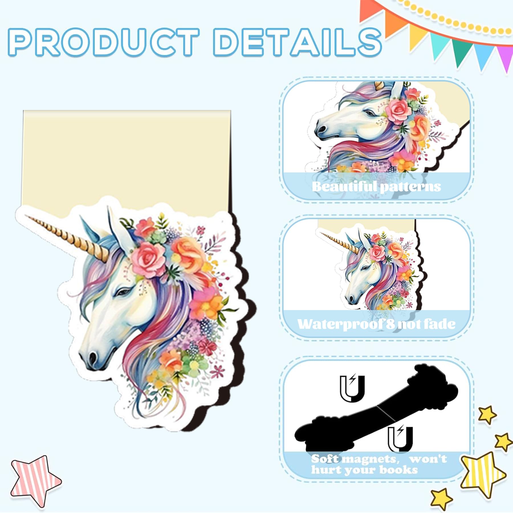 Lesen macht mit diesen Lesezeichen gleich doppelt Spaß! 12 bunte, magnetische Lesezeichen mit süßen Cartoon-Motiven - perfekt für kleine Bücherwürmer! \\n\\nDie Magnetkraft ist super stark - die Lesezeichen halten bombenfest, ohne die Seiten zu knicken oder zu beschädigen. Und die Ecken sind abgerundet, damit sich niemand verletzt. \\n\\nJedes Lesezeichen hat ein anderes Motiv in knalligen Farben - da findet jedes Kind sein Lieblings-Lesezeichen! \\n\\nNicht nur für Bücher gut: \\n- Notizen am Kühlschrank befestigen \\n- Stundenplan ans Whiteboard heften \\n- Schreibtisch dekorieren \\n- In der Schultasche organisieren \\n\\nSuper als Geschenk für: \\n- Einschulung \\n- Geburtstage \\n- Kleine Aufmerksamkeiten \\n- Leseanfänger \\n\\nWasserabweisend und robust - übersteht auch mal eine ungeplante Dusche in der Trinkflasche. Einfach ein tolles Set für alle jungen Leser!