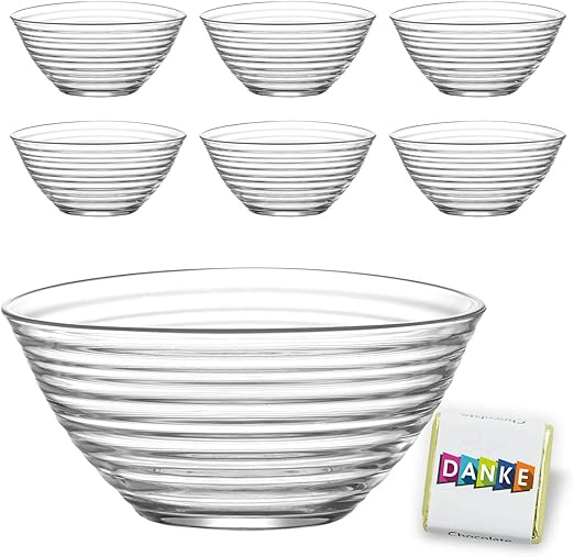 Dieses wunderschöne 5-teilige Glasschalen-Set von LEONARDO bringt Eleganz auf deinen Esstisch! Die CUCINA OPTIC Schalen überzeugen mit ihrem klaren Design und der einzigartigen erhabenen Innenstruktur, die das Licht auf faszinierende Weise bricht. Im Set enthalten: 1 große Schale mit 21,5cm Durchmesser perfekt für Salate oder Nudelsalate und 4 kleinere Schälchen mit 10cm Durchmesser ideal für Desserts, Puddings, Dip-Saucen oder Snacks. Aus hochwertigem, robustem Glas gefertigt, sind die Schalen alltagstauglich und langlebig. Das stapelbare Design spart Platz in deinem Küchenschrank und die runde Form passt zu jedem Tisch-Decko. Ob für den täglichen Gebrauch, besondere Anlässe oder wenn einfach mal Gäste kommen - diese Schalen machen jedes Gericht zum Eyecatcher! Maße: 14x22x22cm, Gewicht: 1,6kg. Hol dir zeitlose Schönheit für deine Küche!