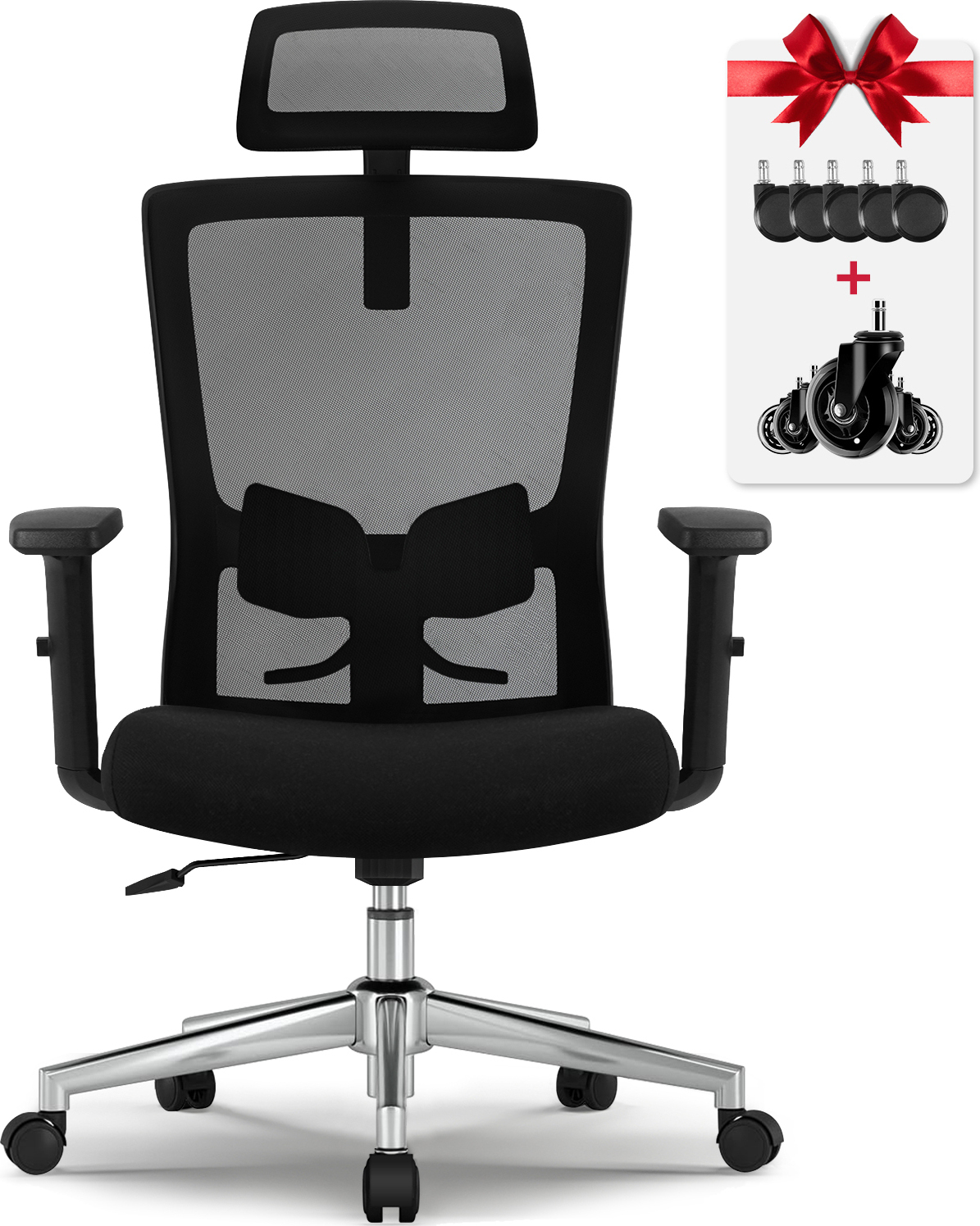 Mensch, dieser ergonomische Bürostuhl ist genau das, was du für lange Arbeitstage im Home-Office oder Büro brauchst! Mit verstellbarer Kopfstütze und integrierter Lendenwirbelstütze sorgt er für eine gesunde Sitzposition und entlastet deine Wirbelsäule. Die atmungsaktive Mesh-Rückenlehne verhindert lästiges Schwitzen selbst an heißen Tagen. Die Wippfunktion mit einstellbarer Kippspannung ermöglicht dynamisches Sitzen - so bleibst du auch nach Stunden noch konzentriert. Die klappbaren Armlehnen geben dir mehr Flexibilität und schonen Nacken und Schultern. Mit dem hochwertigen Gaslift stellst du die Höhe stufenlos von 47-56cm ein und passt den Stuhl perfekt an deinen Schreibtisch an. Die 5 bodenschonenden Leichtlaufrollen gleiten super leicht über jeden Bodenbelag. Bis zu 120kg Belastbarkeit und der stabile Rahmen garantieren lange Haltbarkeit. Die gepolsterte Sitzfläche sorgt für maximalen Komfort auch bei mehrstündiger Nutzung. Mit den Maßen 122-131cm Höhe, 58cm Breite und 66cm Tiefe ist er ein echter Profi-Stuhl für anspruchsvolle Arbeitsplätze. Das moderne Design in Schwarz passt in jedes Büro und macht eine super Figur. Gönn deinem Rücken was Gutes und mach das Arbeiten angenehmer - mit diesem durchdachten Bürostuhl!