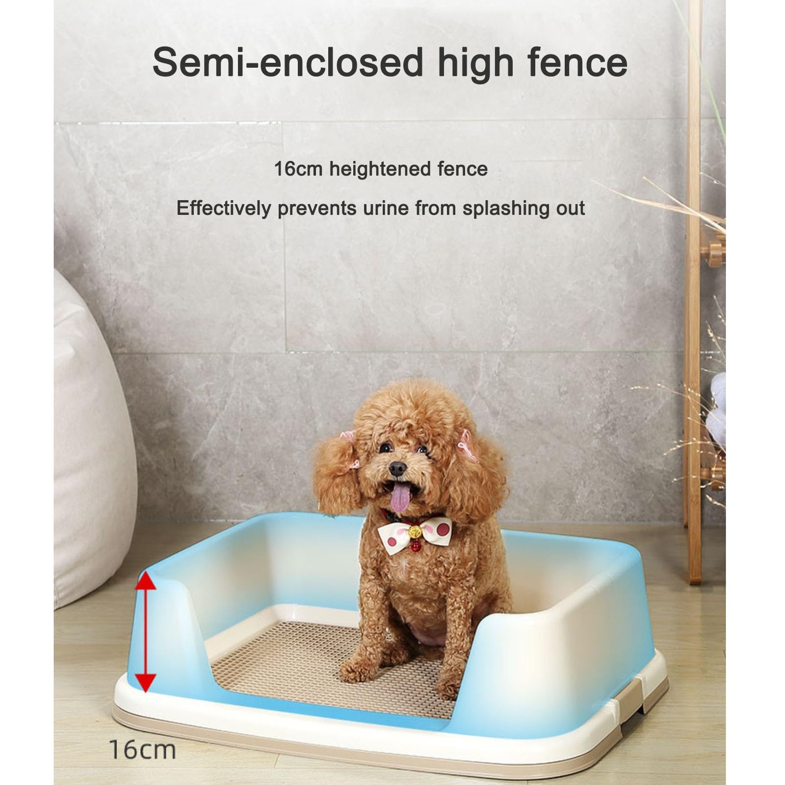 Saubere Lösung für Stadt-Hunde! Diese ROMISBABA Hundetoilette ist der Retter für alle Tage, an denen der Gassigang mal nicht möglich ist oder für Welpen in der Stubenreinheits-Phase.\\n\\nDas clevere Spritzwasserschutz-Design verhindert, dass Urin daneben geht - deine Böden bleiben sauber und geschützt. Das Gitter verhindert, dass die Pfötchen deines Lieblings einsinken.\\n\\nPraktische Details:\\n- Maße: 45,5 x 35 x 5 cm\\n- Material: Robustes blau-graues Plastik\\n- Leicht zu reinigen und zu warten\\n- Netz-Boden für Pfotenschutz\\n\\nDie Toilette lässt sich einfach auseinandernehmen und gründlich reinigen. Du kannst sie als reine Urintoilette nutzen oder mit Streu/Sand befüllen - je nach Vorliebe deines Hundes.\\n\\nIdeal für:\\n- Welpen in der Lernphase\\n- Ältere Hunde mit Mobilitätseinschränkungen\\n- Wohnungshunde in Hochhäusern\\n- Bei extremem Wetter\\n- Nachts für kleine Rassen\\n\\nEndlich eine praktische und hygienische Lösung für die kleinen Geschäfte deines Vierbeiners!