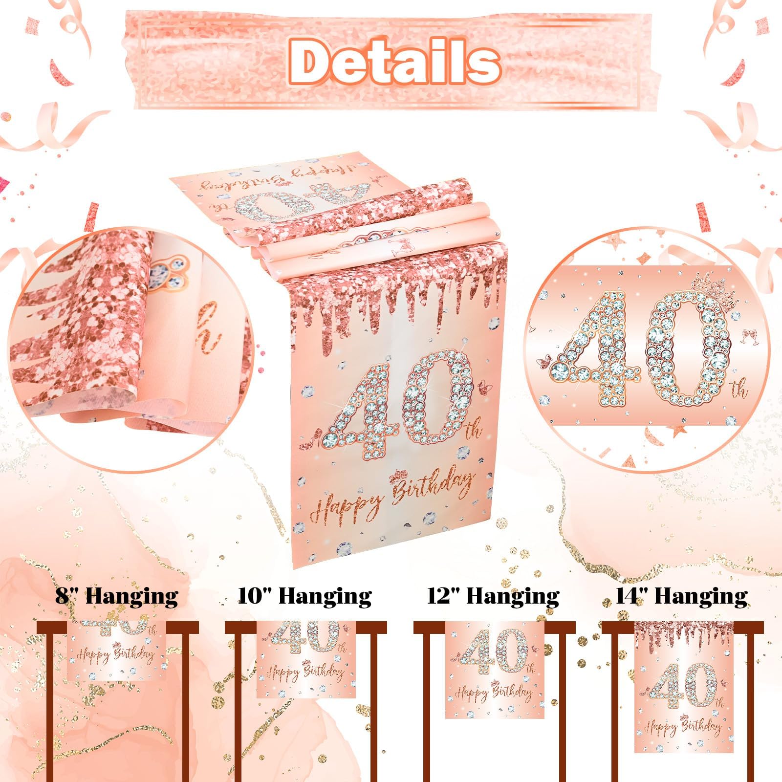 Wow, was für ein traumhafter Tischläufer für den 40. Geburtstag! In wunderschönem Rosegold mit glitzerndem Konfetti bringt dieser 10 Meter lange Läufer sofort Partystimmung auf deinen Tisch. Die 28cm Breite ist perfekt für Tische jeder Größe und die 10 Meter Länge geben dir genug Spielraum für kreative Dekorationen. Enthalten sind über 250 glitzernde Konfetti-Teile mit 'Happy Birthday' Aufschrift und silbernen Sternen. Aus strapazierfähiger Polyesterfaser, die du bei Bedarf einfach zuschneiden kannst. Der metallische Glanz verleiht jeder Feier eine elegante Atmosphäre und wenn das Licht darauf fällt, funkelt es einfach magisch! Perfekt nicht nur für den 40., sondern für jeden Geburtstag, Jubiläum oder besondere Anlässe. Einfach ausrollen, dekorieren und nach der Party wieder sauber aufrollen - der Läufer ist so stabil, dass du ihn mehrmals verwenden kannst. Achtung: Enthält Kleinteile, nicht für kleine Kinder geeignet. Mach die Geburtstagsfeier unvergesslich!