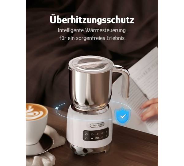 Kaffeeliebhaber, aufgepasst! Dieser Milchaufschäumer von Hazel Quinn kann einfach alles. Mit 5 Funktionen: dicker Schaum, leichter Schaum (beide heiß), Kaltaufschäumen, Milcherwärmung und sogar heiße Schokolade! Das 450 ml Fassungsvermögen ist perfekt für große Tassen. Aus Edelstahl 304 - also BPA-frei und super gesund. Die intelligente Temperaturregelung mit 4 Stufen (45°C/55°C/65°C plus kalt) gibt dir immer den perfekten Schaum. LED-Touch-Bedienung sieht nicht nur cool aus, sondern ist auch mega praktisch. Und das Beste: Der Behälter ist spülmaschinengeeignet! Magnetischer Standfuß verhindert lästiges Umkippen. Ob für Cappuccino, Latte Macchiato oder einfach nur warme Milch - hier kriegst du professionelle Ergebnisse wie vom Barista. Ein Must-have für jede Küche!