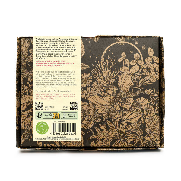 Altes Kräuterwissen neu entdecken! Diese hübsche Box enthält 9 verschiedene Wildkräuter-Sorten, die unsere Großeltern noch kannten. Da ist für jeden Geschmack was dabei: Kerbel für Suppen, Portulak für Salate, Oregano für mediterrane Gerichte und sogar Borretsch mit seinen essbaren blauen Blüten! Die Samen-Tütchen sind in einer stabilen Geschenkbox verpackt - sieht aus wie alte botanische Zeichnungen, richtig schön gemacht. Super praktisch: Auf jedem Tütchen steht kurz erklärt, was zu tun ist, und per QR-Code gibt's detaillierte Anleitungen in fünf Sprachen. Ob du jetzt Anfänger oder erfahrener Gärtner bist - mit diesen Kräutern holst du dir die Natur auf den Balkon, die Terrasse oder in den Garten. Die Kräuter schmecken nicht nur gut in Salaten und Tees, sondern sehen auch noch dekorativ aus. Perfektes Geschenk für alle, die gerne mit natürlichen Zutaten kochen oder einfach mal was Anderes als Basilikum und Petersilie anbauen wollen!