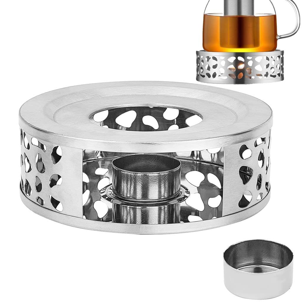 Genieße deinen Tee oder Kaffee in aller Ruhe - warm bleibt er mit diesem eleganten Edelstahl-Stövchen! Der silberne Tee-Untersetzer hält deine Getränke lange warm und ist kompatibel mit Teekannen aus Edelstahl, Borosilikatglas und vielen anderen Materialien. Das hohle Design des Rahmens sieht nicht nur schick aus, sondern ermöglicht auch eine vollständige Verbrennung des Teelichts und zaubert eine gemütliche Atmosphäre bei schlechten Lichtverhältnissen. Die hochwertige Verarbeitung garantiert stabilen und dauerhaften Gebrauch. Achtung: Das Metall leitet Wärme gut - warte bitte eine Weile, nachdem das Teelicht ausgebrannt ist, um Verbrennungen zu vermeiden. Passt für Gefäße mit einem Durchmesser von 2,4 bis 5,5 Zoll und ist inklusive praktischem Kerzenhalter, der ein Überlaufen verhindert. Einfach von Hand reinigen und immer wieder verwenden. Perfekt für gemütliche Abende, Familienfeiern oder einfach nur zum Entspannen!