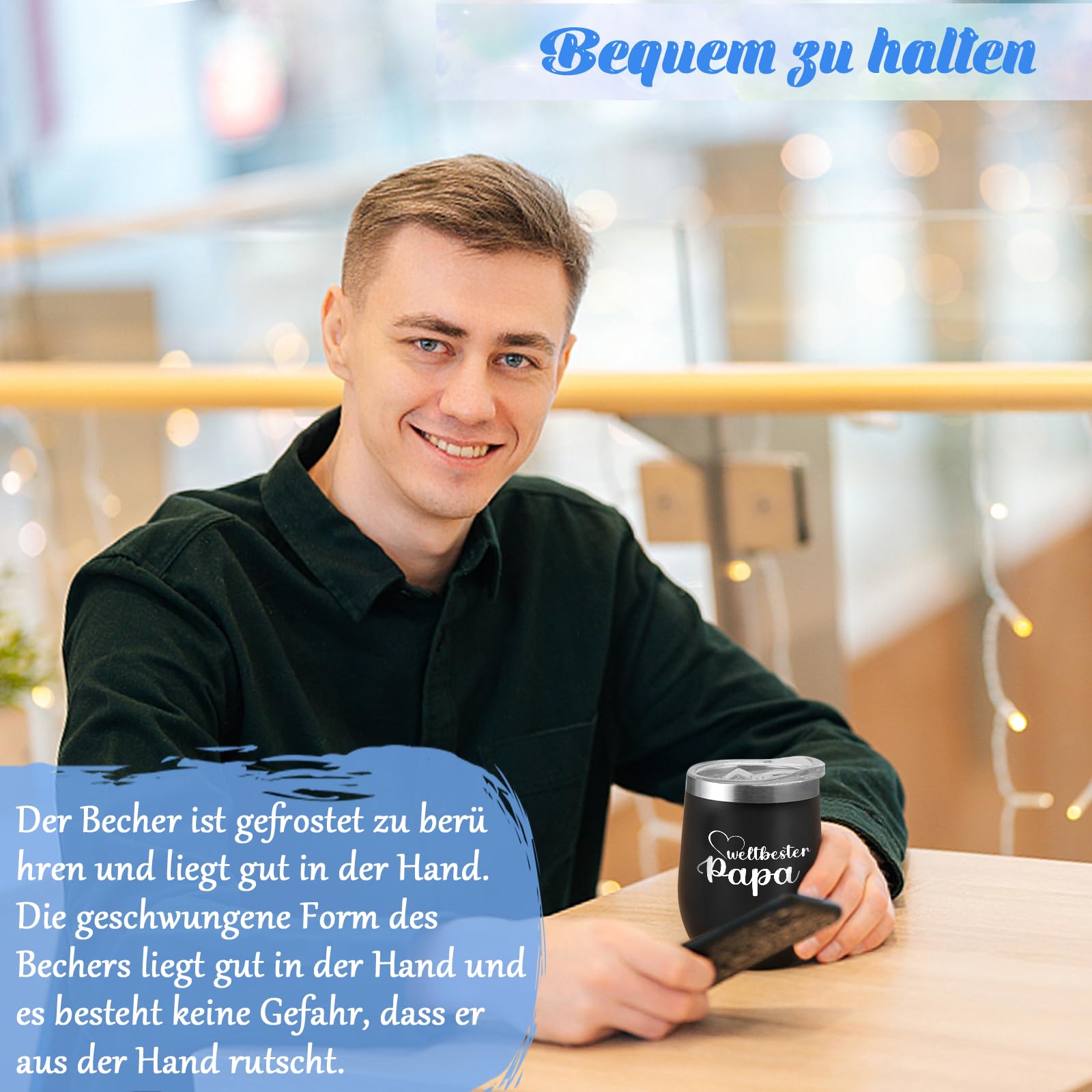Das perfekte Geschenk für den besten Papa der Welt! Dieses vollständige Set enthält alles was das Papa-Herz begehrt: Einen 12 Unzen (ca. 340ml) Thermobecher aus 304 Edelstahl mit Deckel und Strohhalm, einen edlen Schlüsselanhänger aus Edelstahl, einen stylischen Kugelschreiber, eine persönliche Grußkarte und einen praktischen Korkuntersetzer. Alles mit liebevollen Sprüchen wie 'Bester PAPA der Welt' bedruckt. Perfekt für Vatertag, Geburtstag, Weihnachten oder einfach mal so als Dankeschön. Der Becher hält Getränke lange warm oder kalt und ist absolut robust. Ein Geschenk das von Herzen kommt und garantiert für strahlende Augen sorgt!