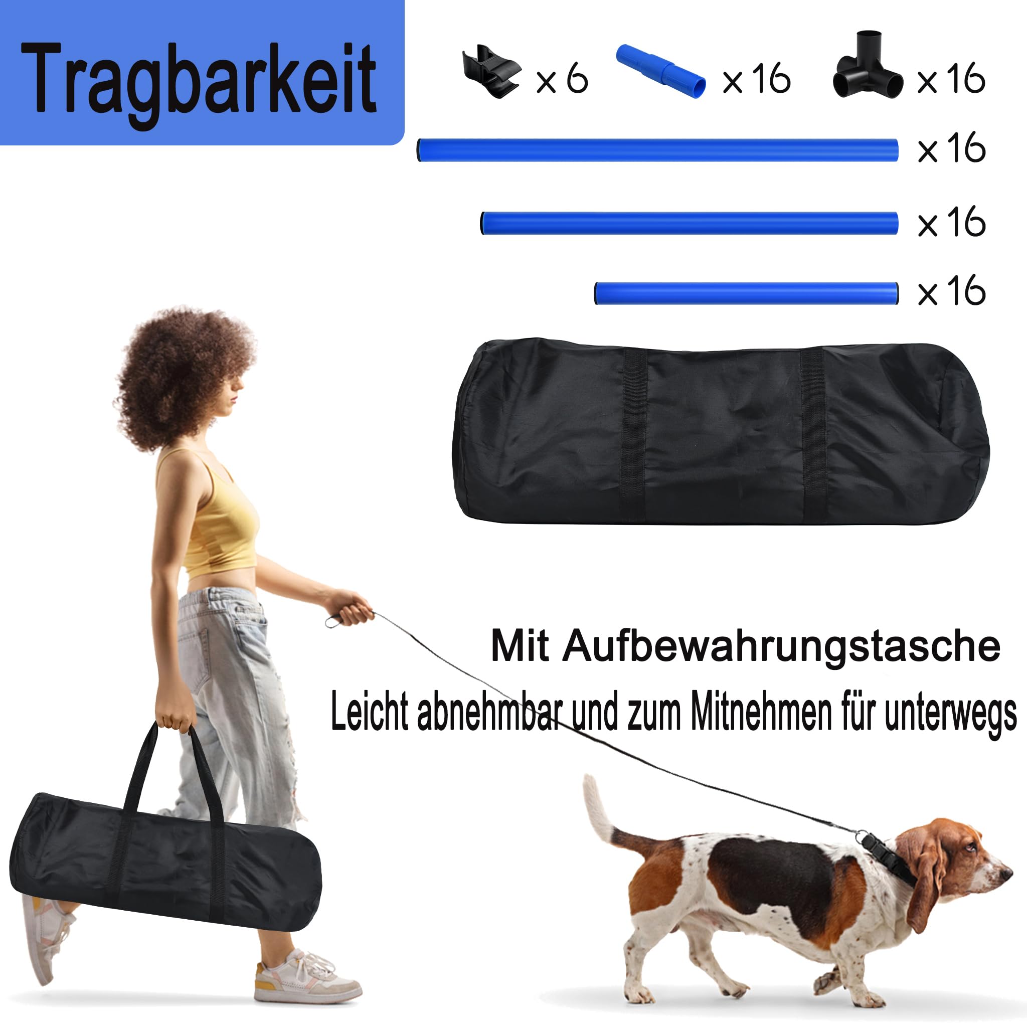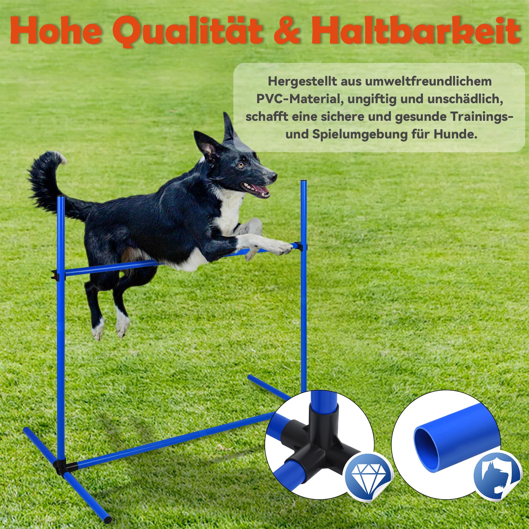 Mach deinen Hund zum Agility-Champion! Dieses 4-teilige Hürdenset ist perfekt für Hunde aller Größen (klein/mittel/groß). Maße: 104x70x101cm. Die Höhe ist mit Schlauchklemmen einfach verstellbar - passt sich jeder Rasse und Trainingsstufe an. Aus sicherem, umweltfreundlichem PVC-Material, leicht zu reinigen. Schnell auf- und abbaubar, inklusive praktischer Tragetasche für unterwegs. Ideal für Sprungtraining, Geschicklichkeitsübungen und gemeinsame Aktivitäten. Stärkt die Bindung zwischen dir und deinem Hund und verbessert dessen Gehorsam, Geschwindigkeit und Beweglichkeit. So macht Training Spaß!